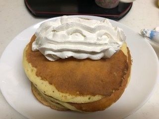 たっぷりの生クリームを薄いホットケーキにたっぷり絞ります。