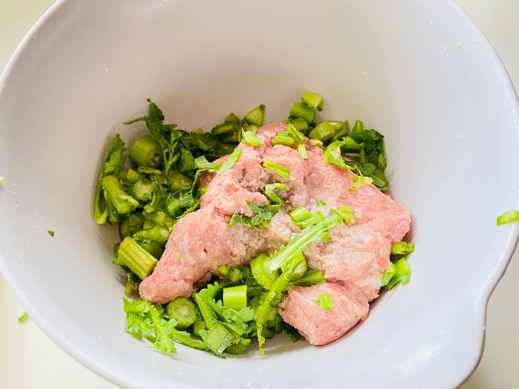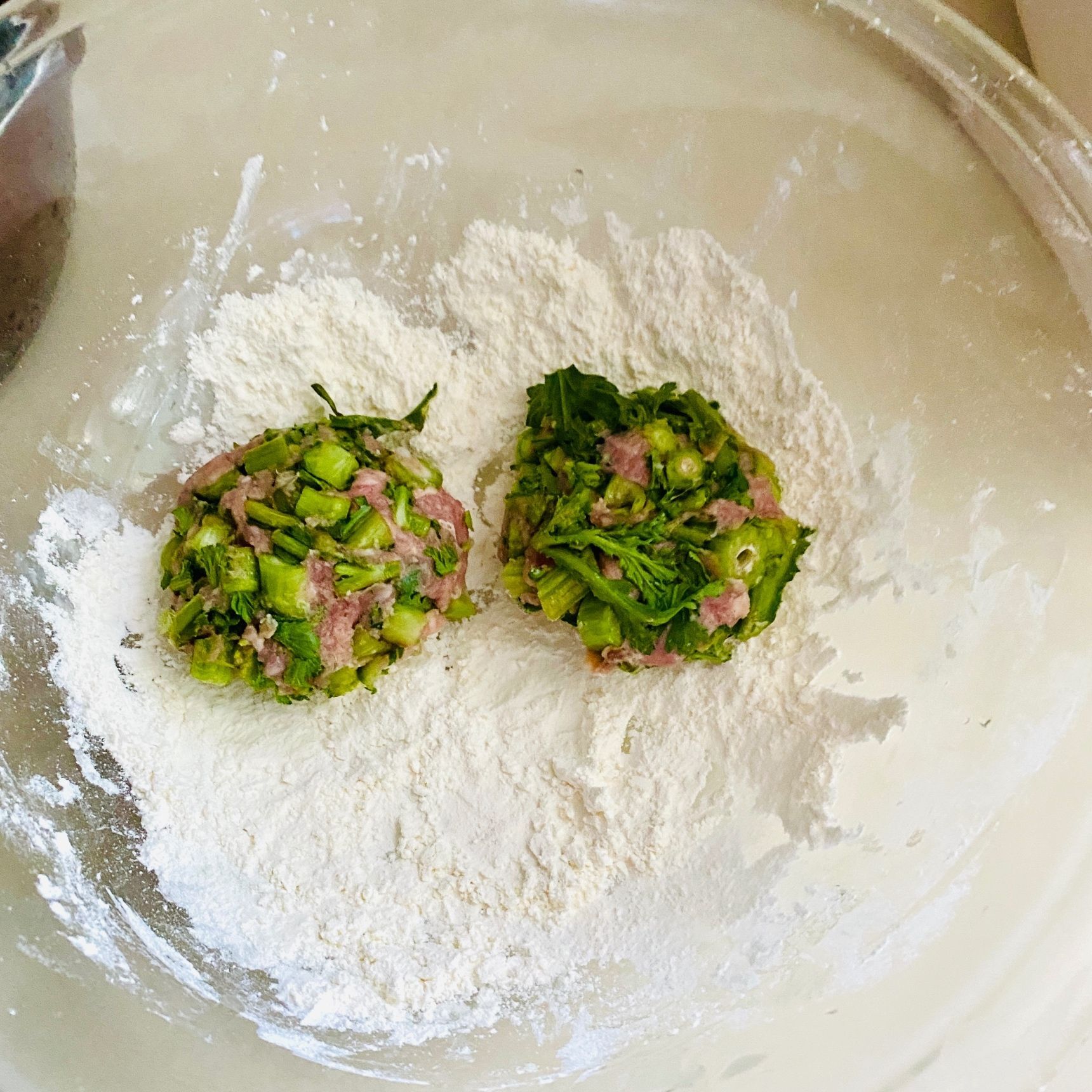 パン粉大さじ2に牛乳大さじ2を加え浸したものを①に加えよく捏ねます。細く切った春菊を①加えよく混ぜます。