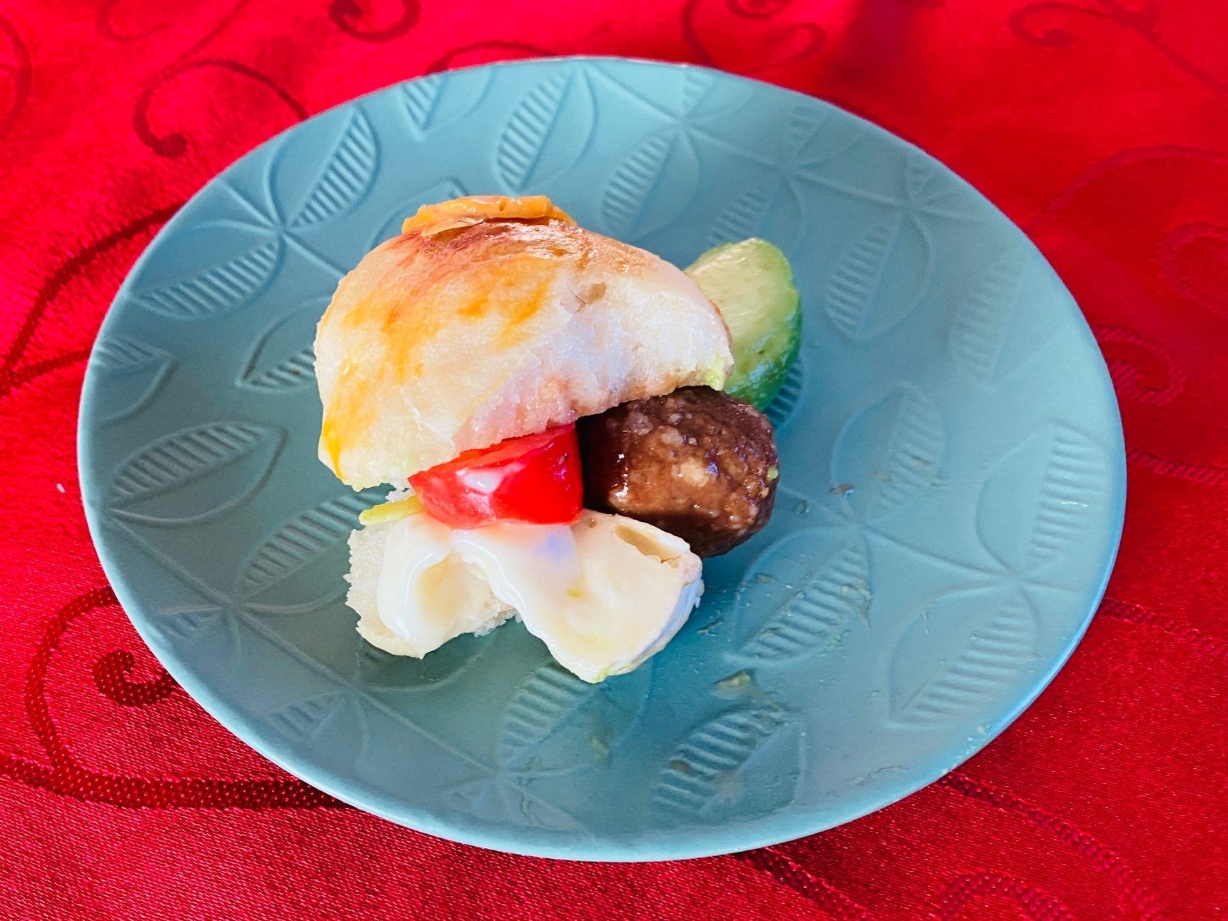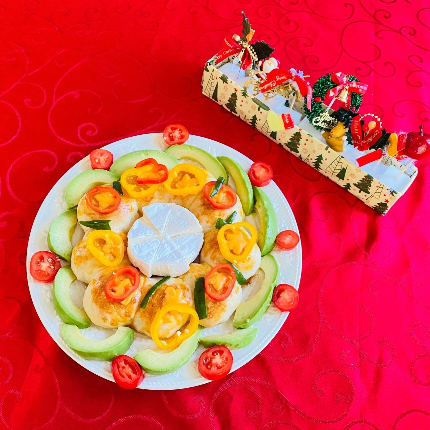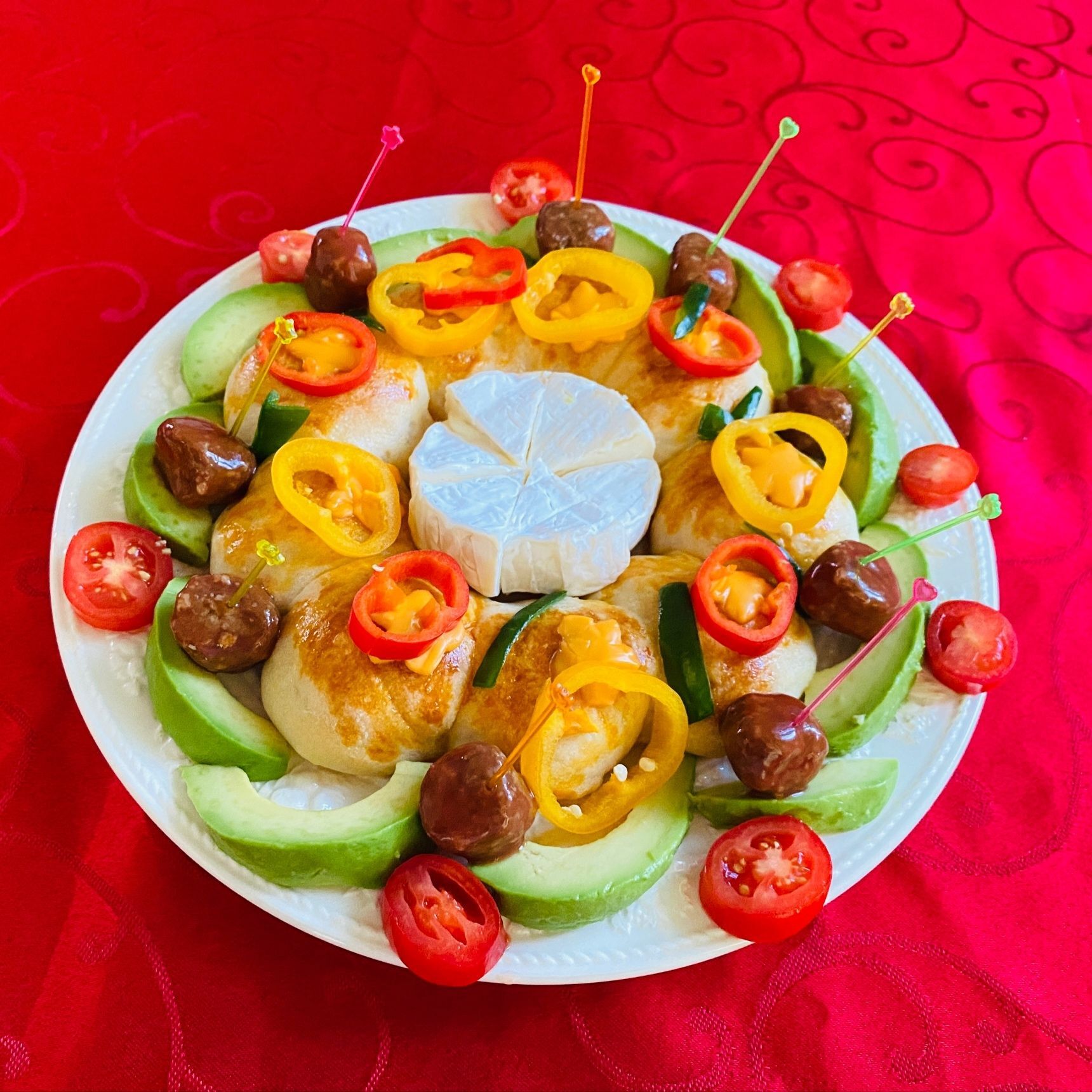 ⑥お皿に盛り付け、チーズやパプリカ、トマト、アボカド、カマンベールチーズを飾ります。