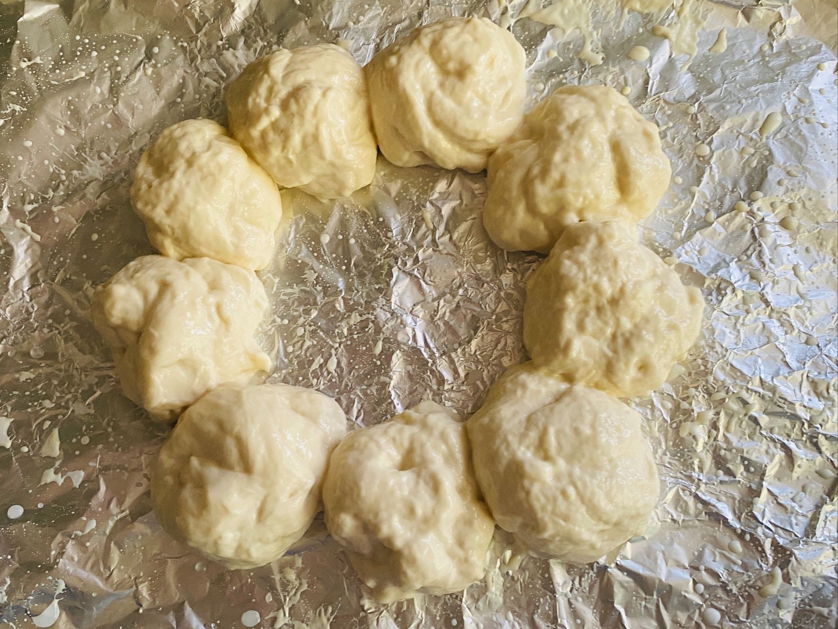④真ん中から空気を抜いて、1個40gぐらいに丸めて9個作ります。