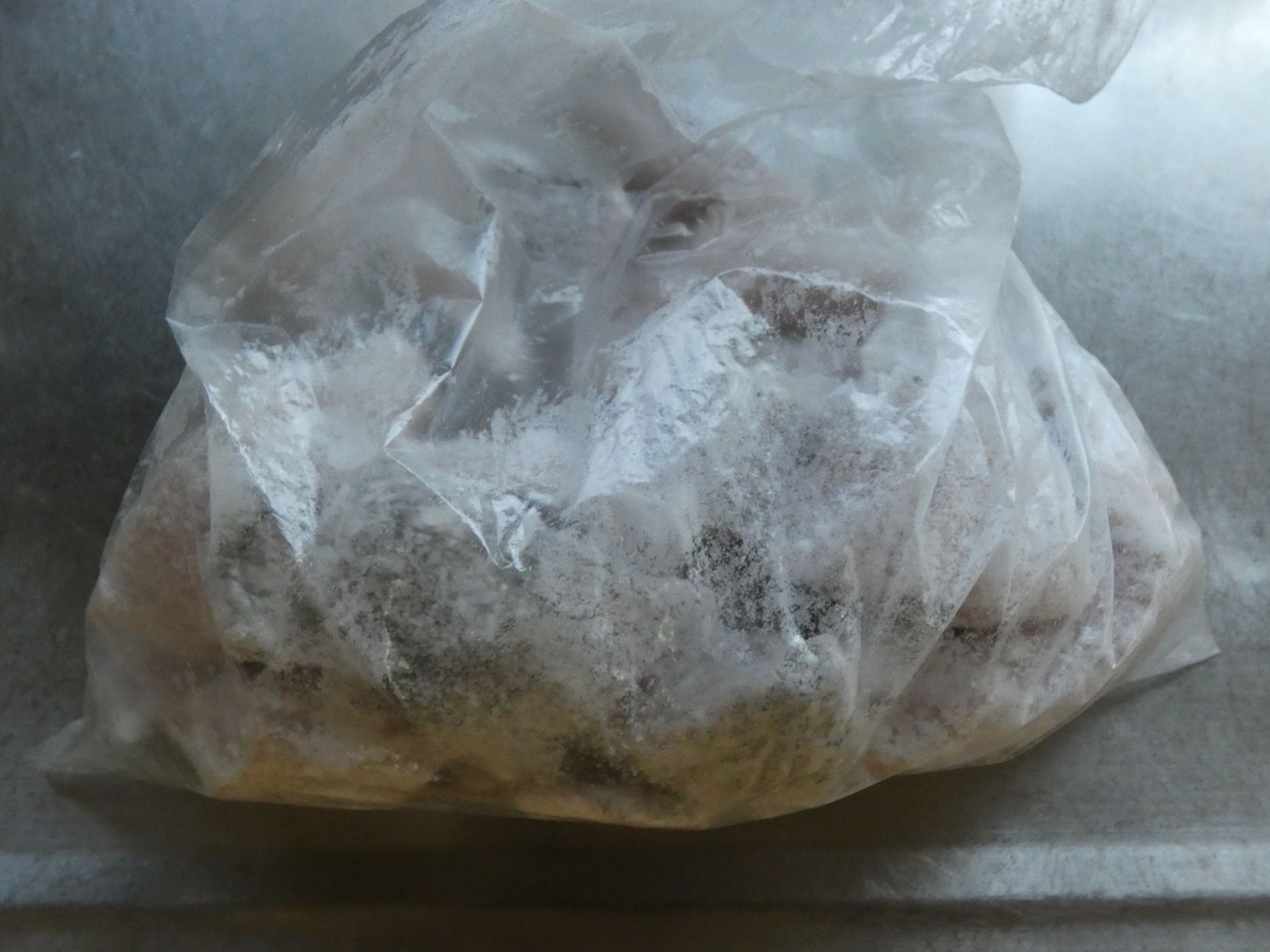 片栗粉をまぶすときはポリ袋に入れてふると、全体に薄くしっかりまぶせます。