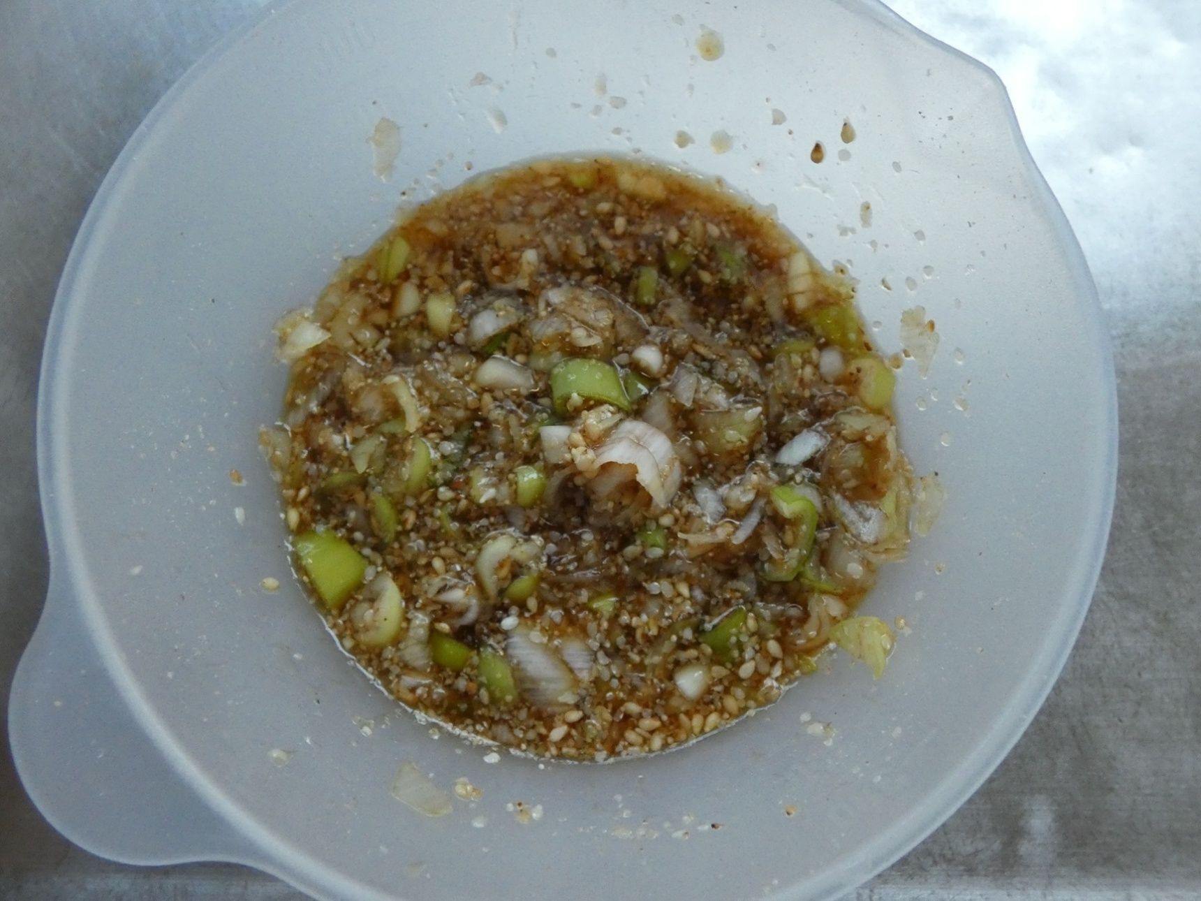 長ネギと白ごま、めんつゆを混ぜ合わせます。