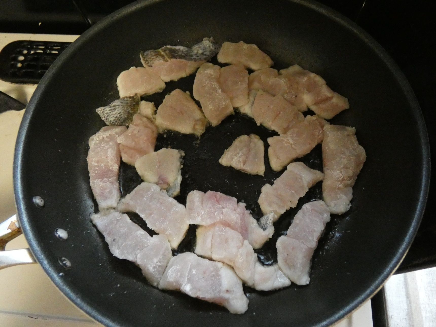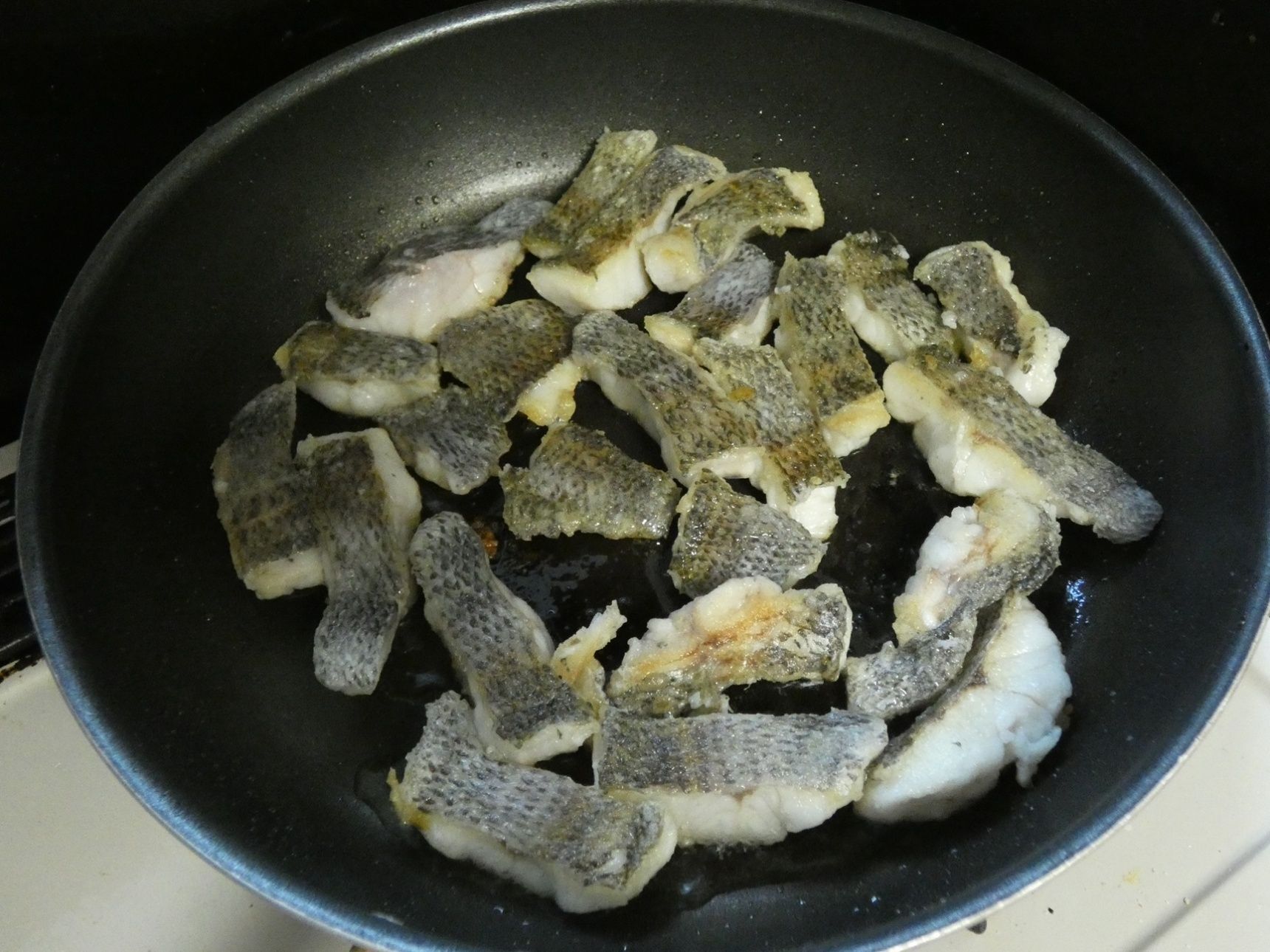 フライパンに油をひき、皮目を下にして黒ムツを焼きます。