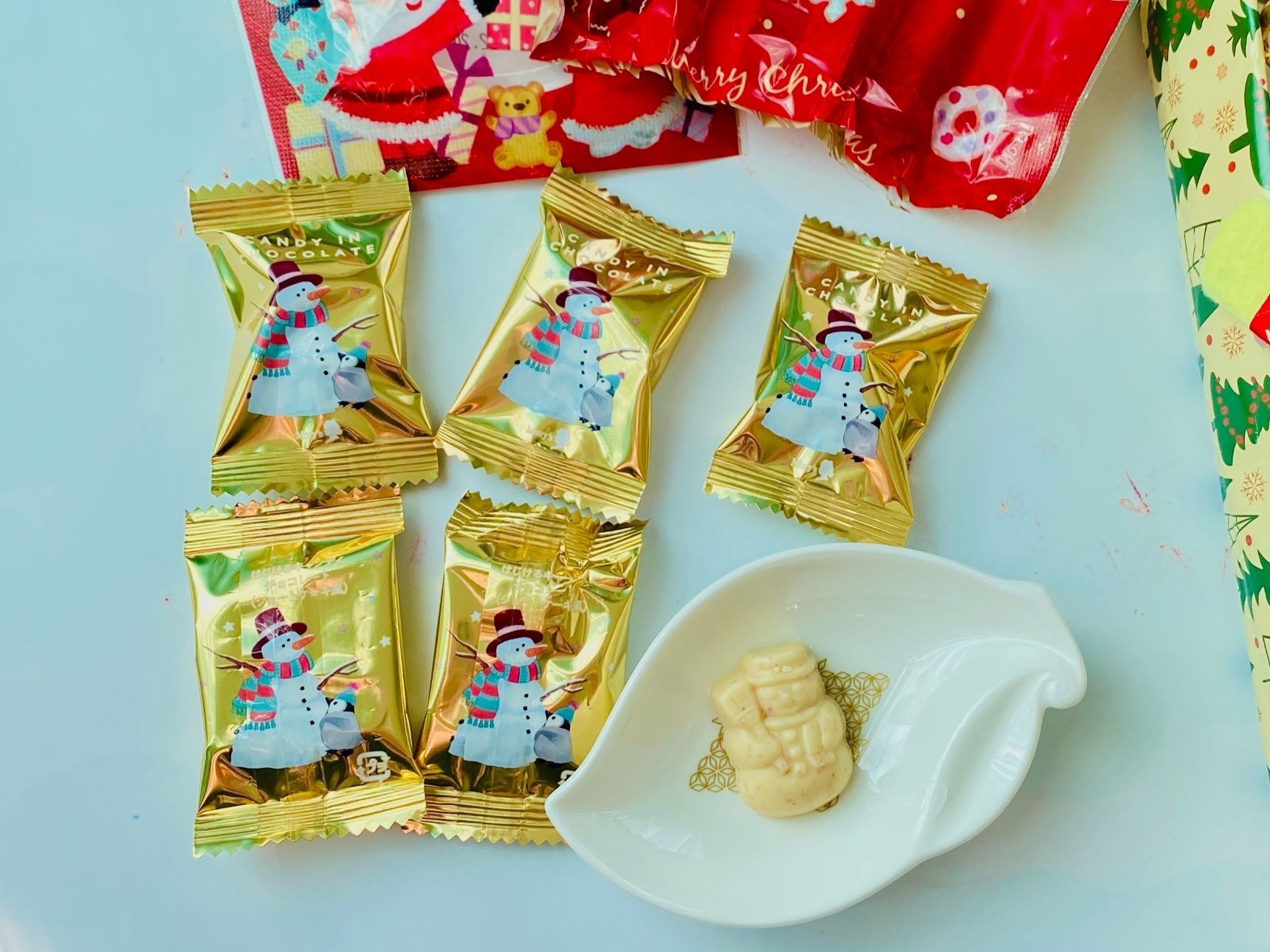 スノーマンの形をした、パチパチはじけるキャンディ入りチョコレートが入っています。
