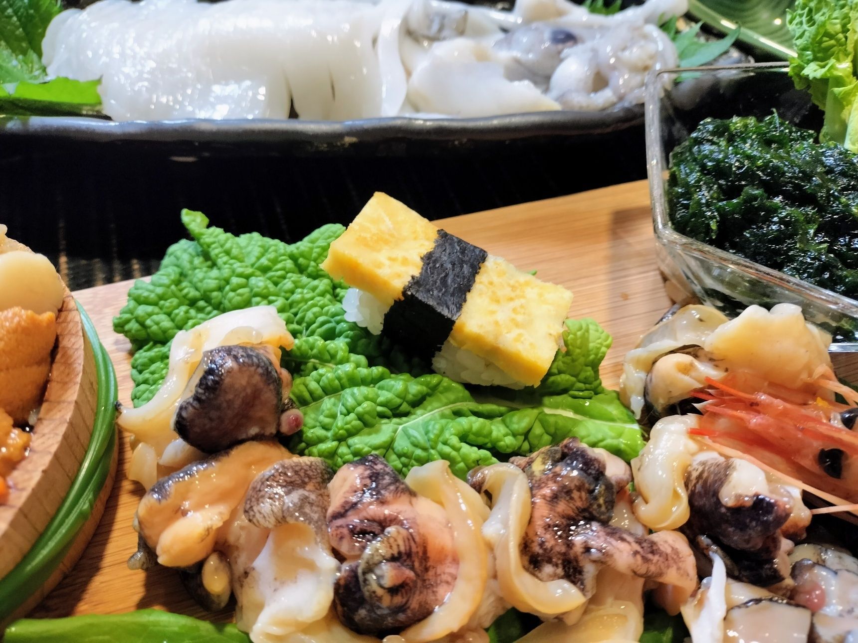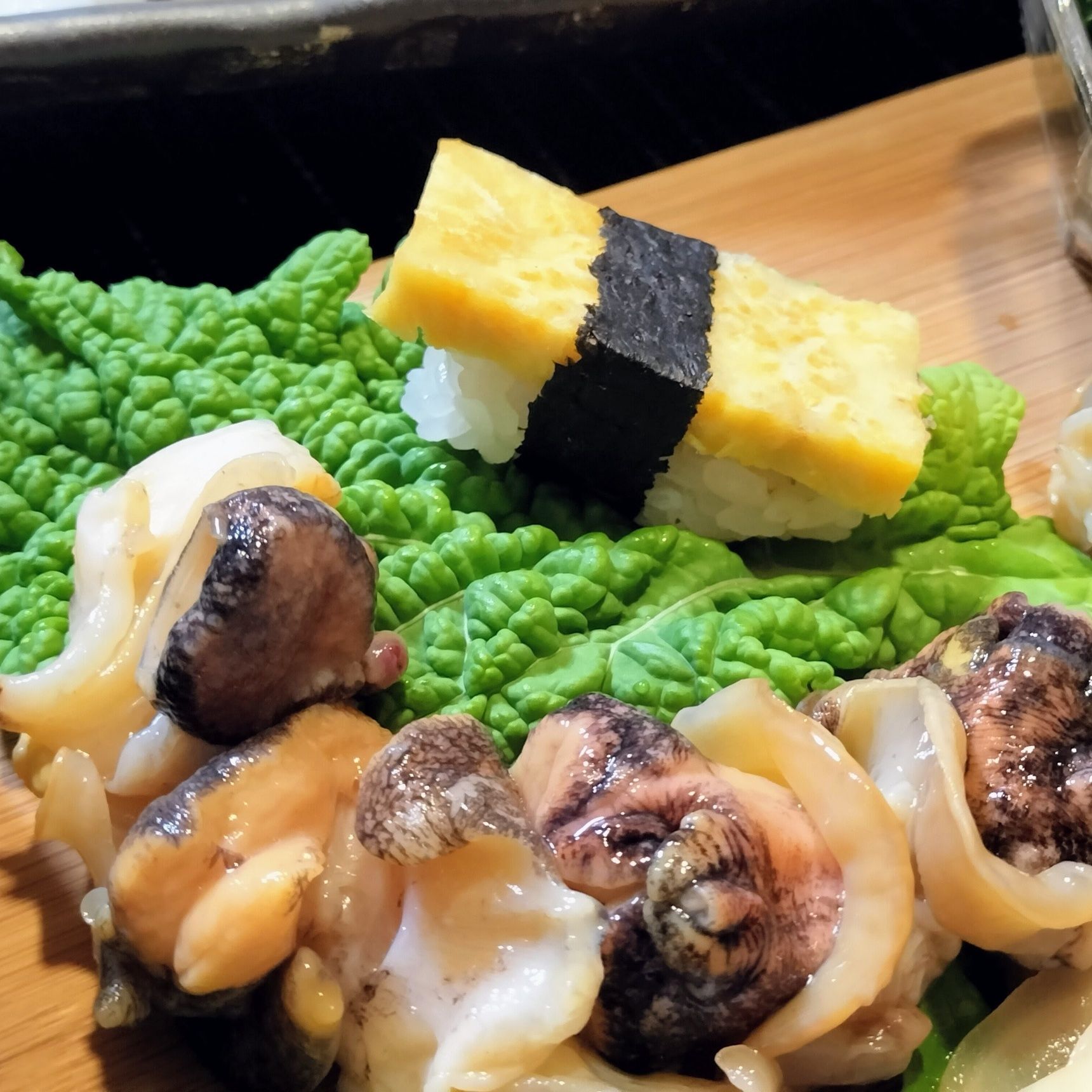 (左から、国産あわび1貫・つぶ貝2貫・赤海老1貫・甲イカ1貫)