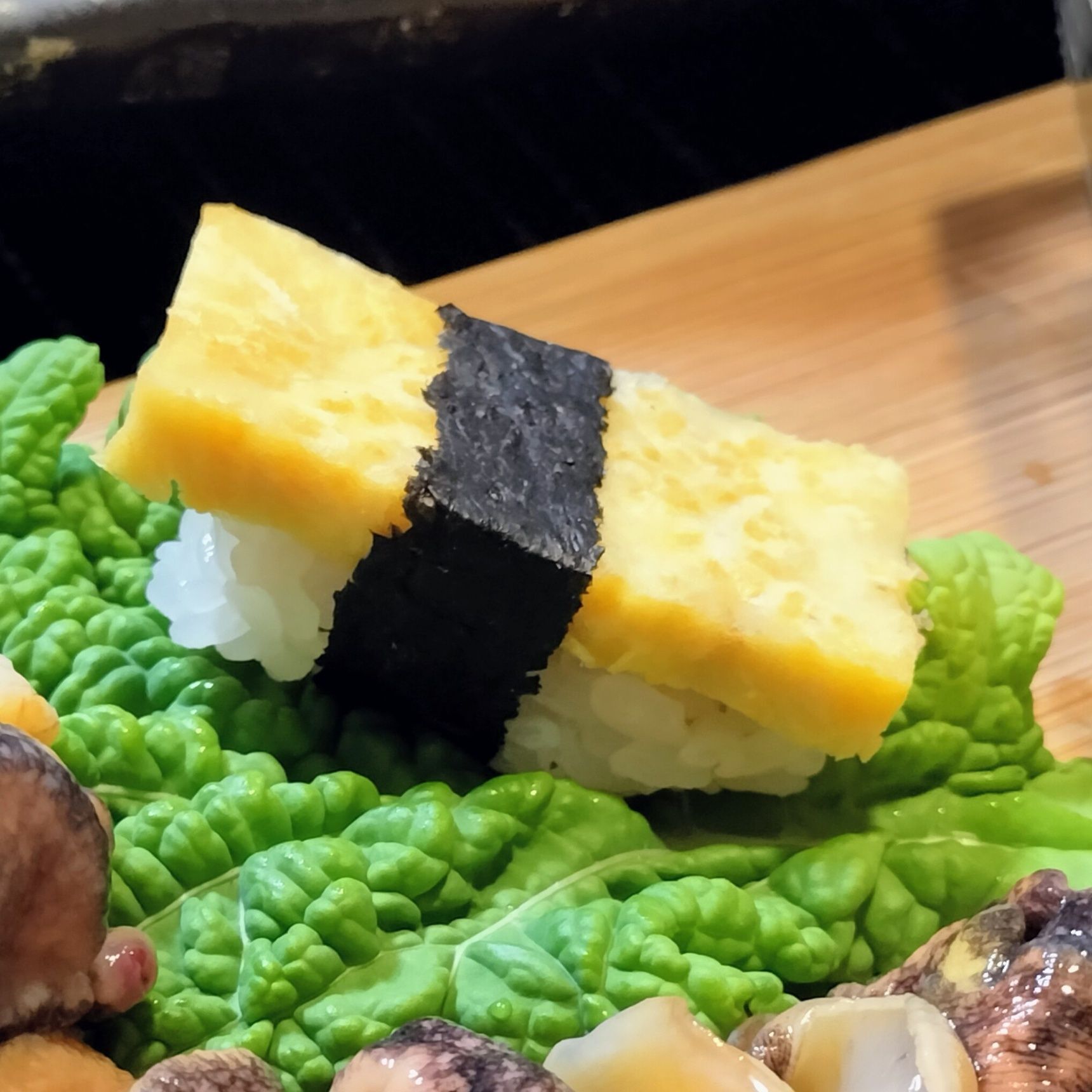 卵焼きのような橙色に近い黄色の肉色なので、卵の握り寿司に見立てて作ってみました!少量の天然塩をかけて、いただきまーす!