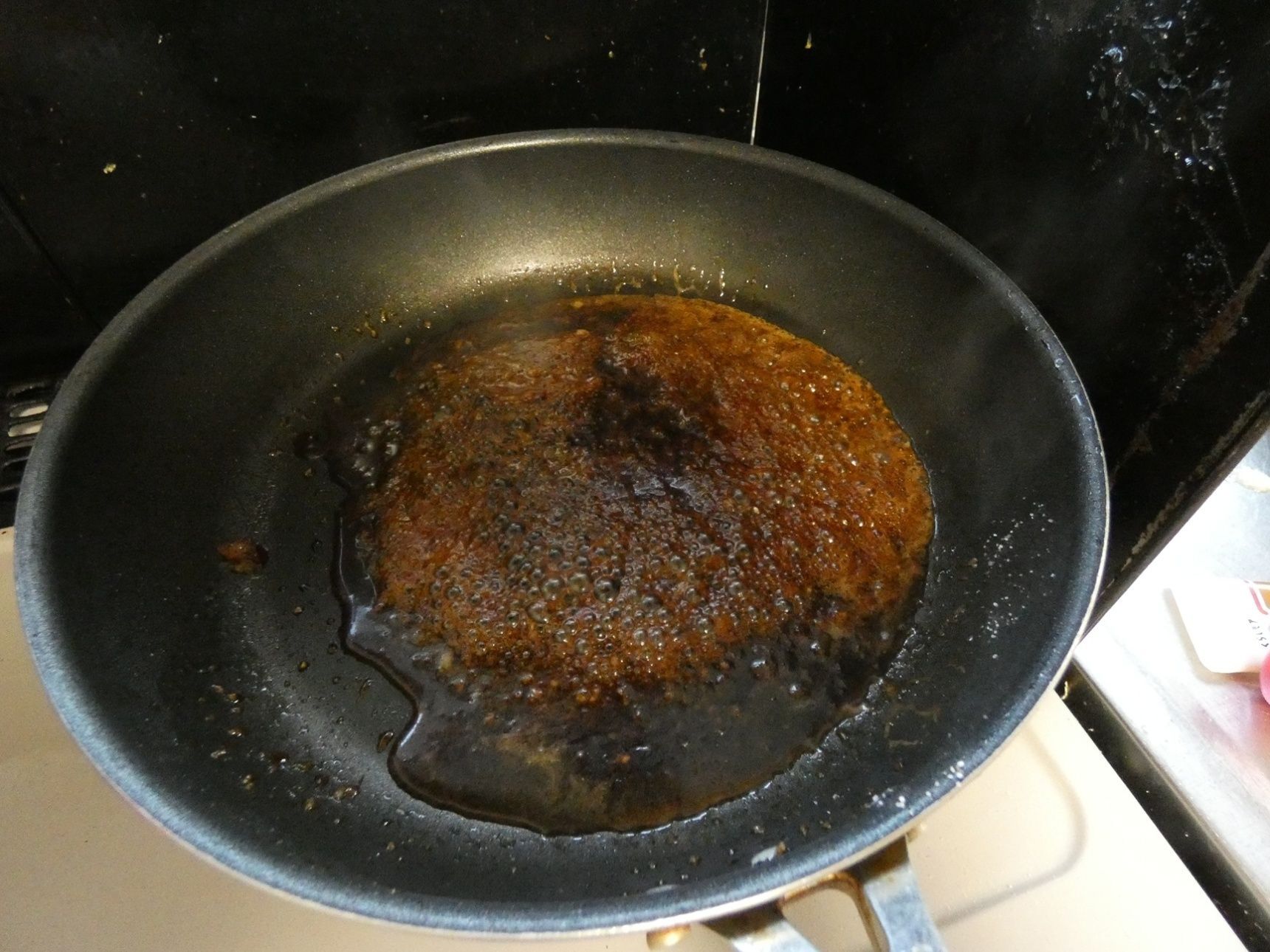 全体に焼き色がついたら一度取り出します。Aの材料を入れて軽く煮詰めます。