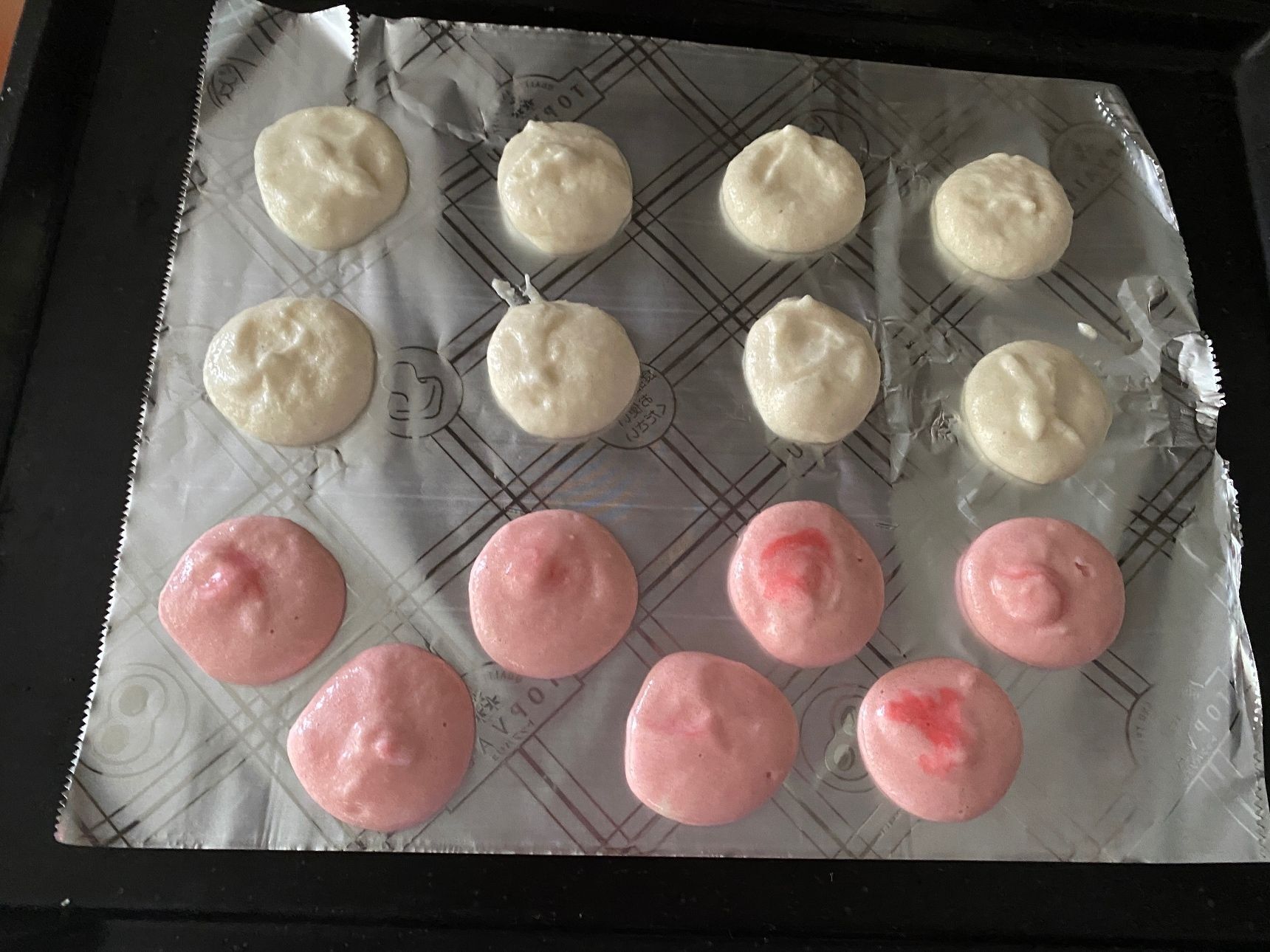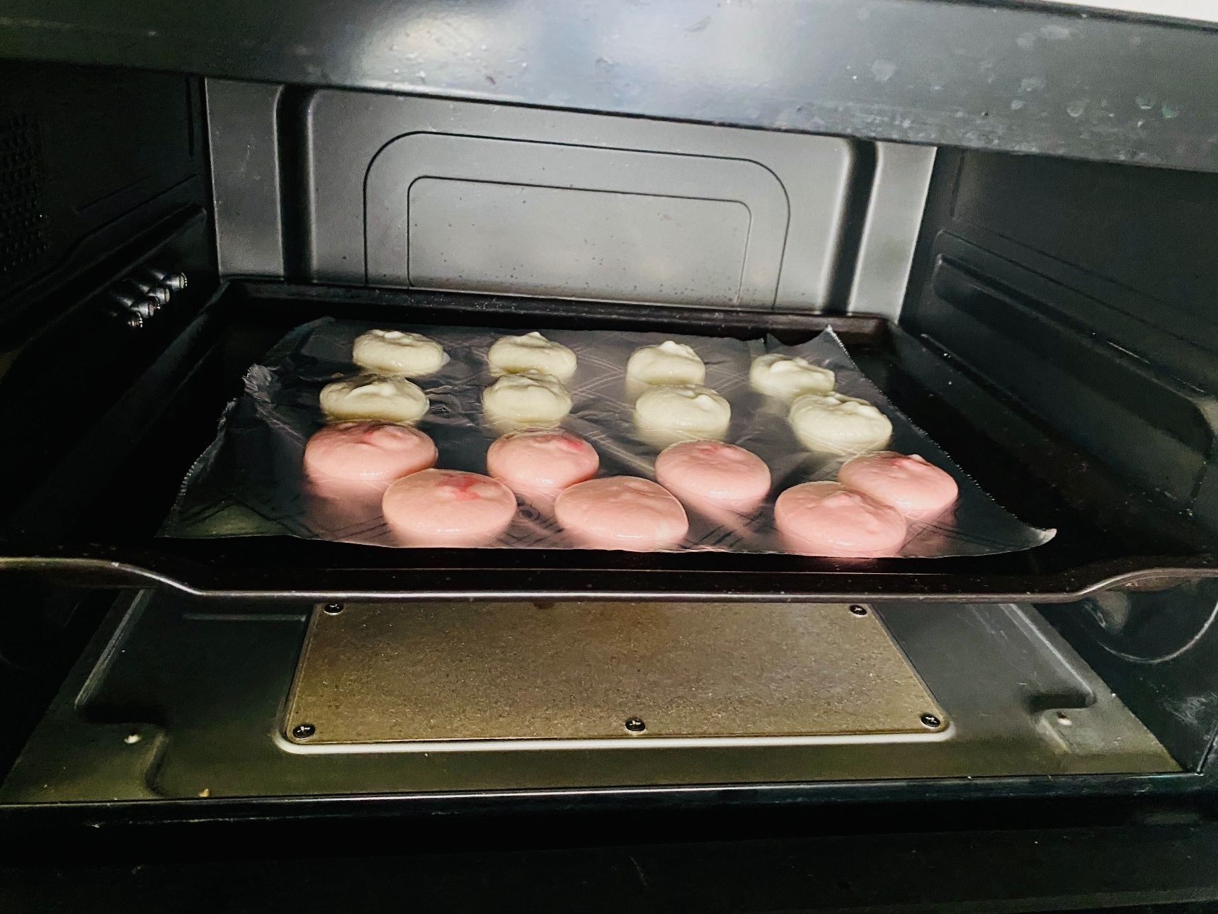マカロンクッキーは、焼き上がってもプルプル状態なので、粗熱が取れるまでオーブンの中でそのままにしておくと落ち着きますよ。