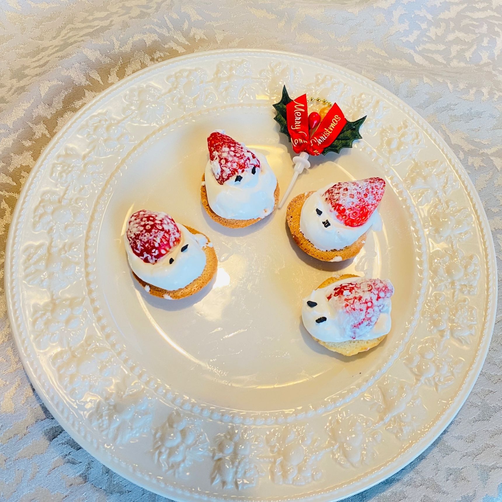 ホイップクリームをのせて、半分にカットした苺、目はチョコの端っこをちょこんとのせて、粉糖をかけてみました。ミニサンタの出来上がり!