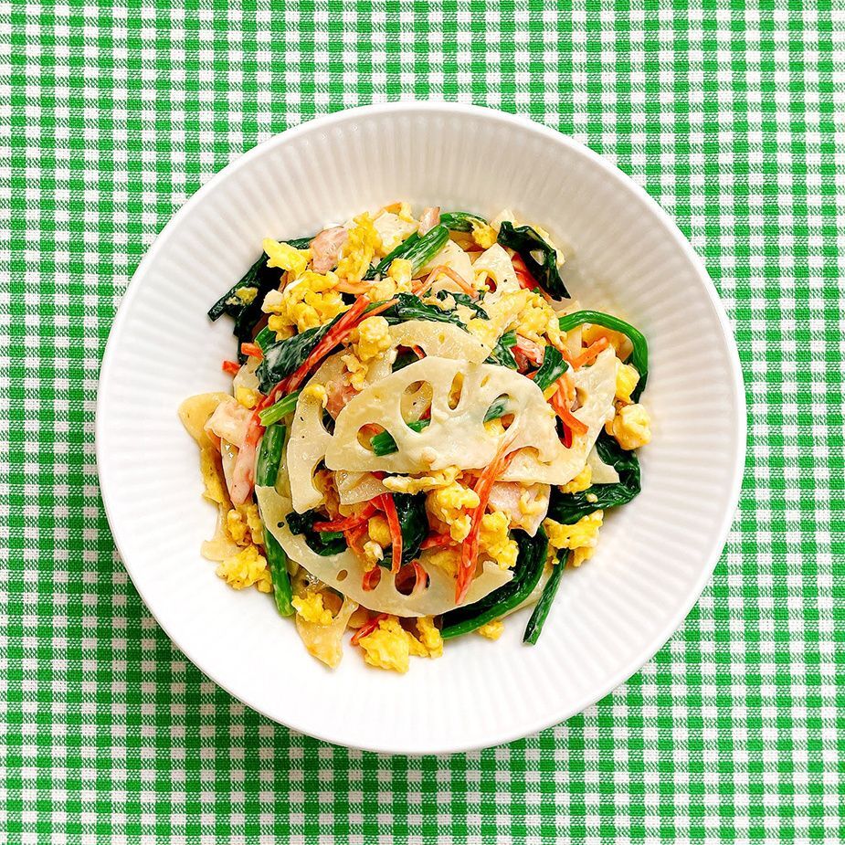 れんこんが透き通ってきたら、ベーコン、ニンニクを加えて炒め合わせ、ほうれん草を加えてひと混ぜする。