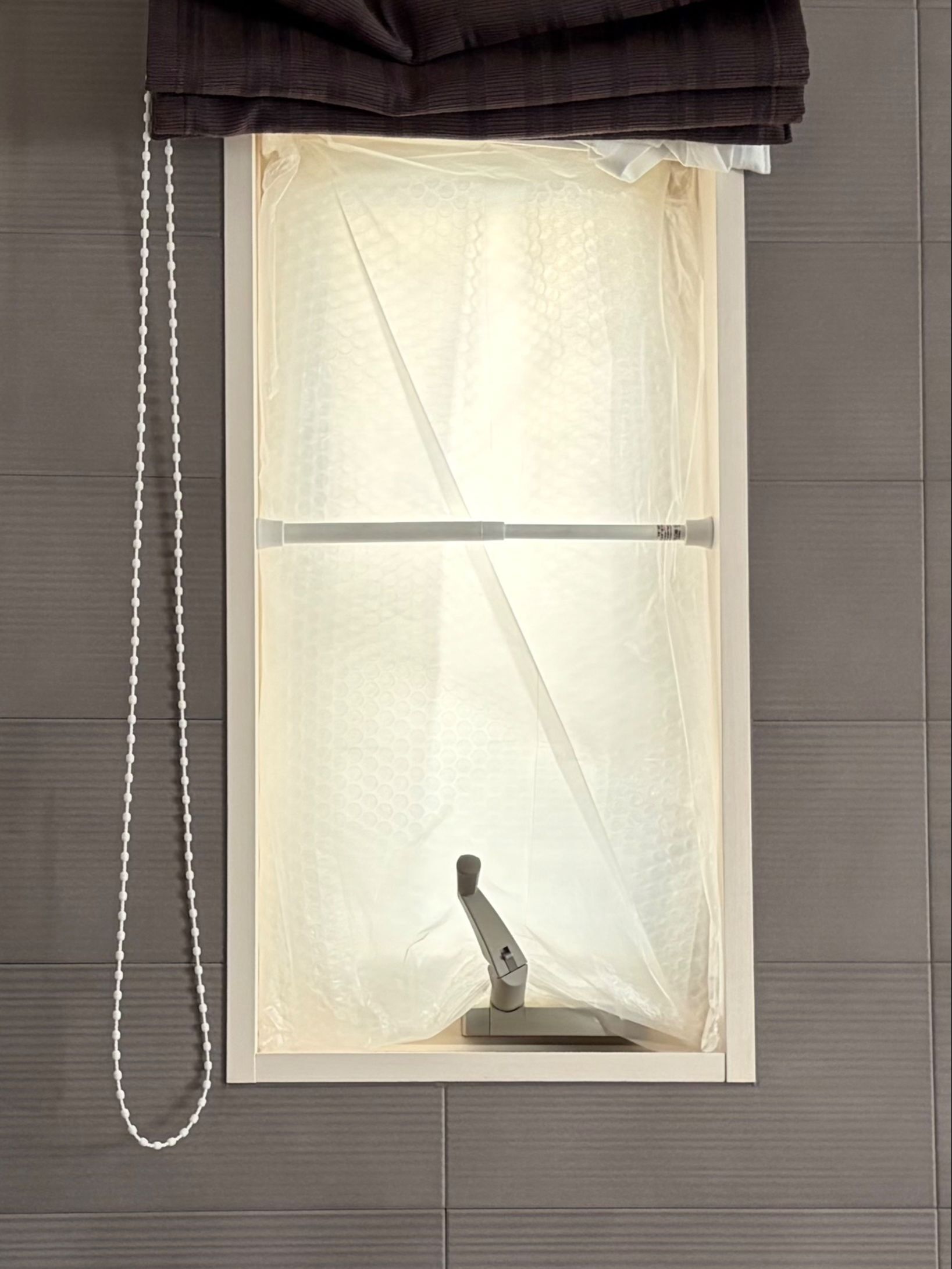 エアパッキンとビニール袋で作った空気のクッションが、窓からの冷気をしっかり遮ってくれます。