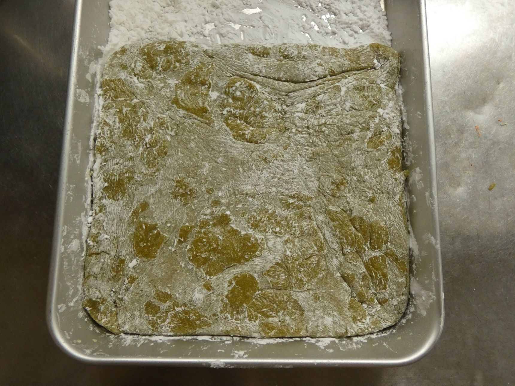 もちとり粉(片栗粉)をバットに広げて、つきあがったもちをのばし、少し固まったところで切り分ければ完成。