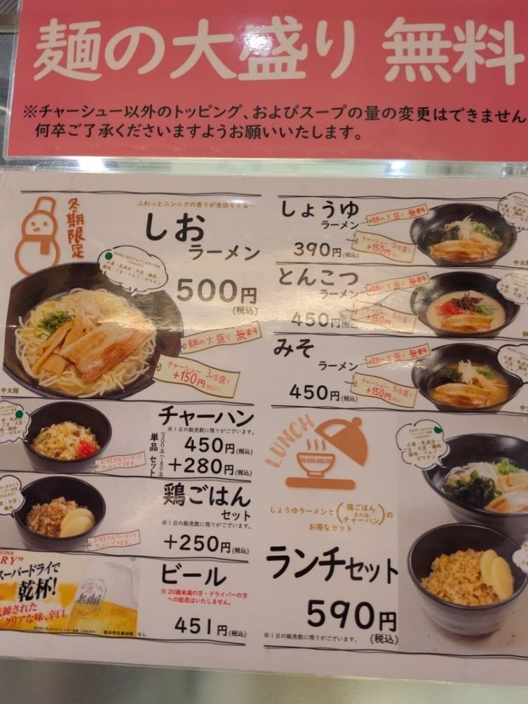 なんとこのお店、最安390円でラーメンが食べることが出来ます!しかも大盛り無料です。