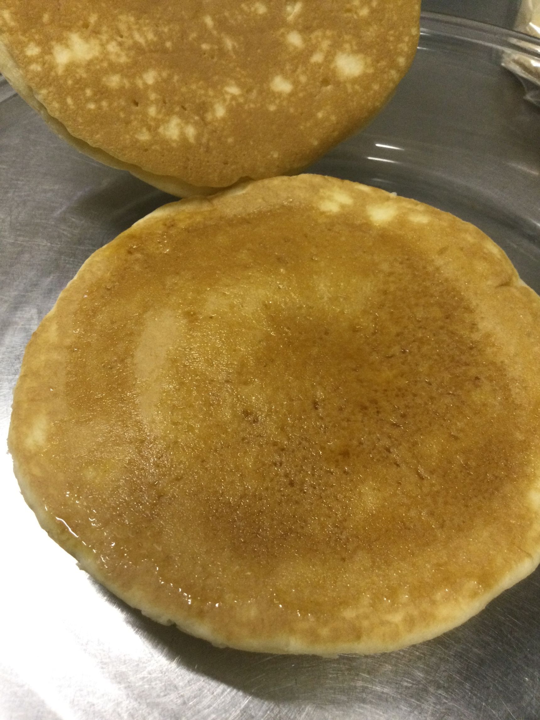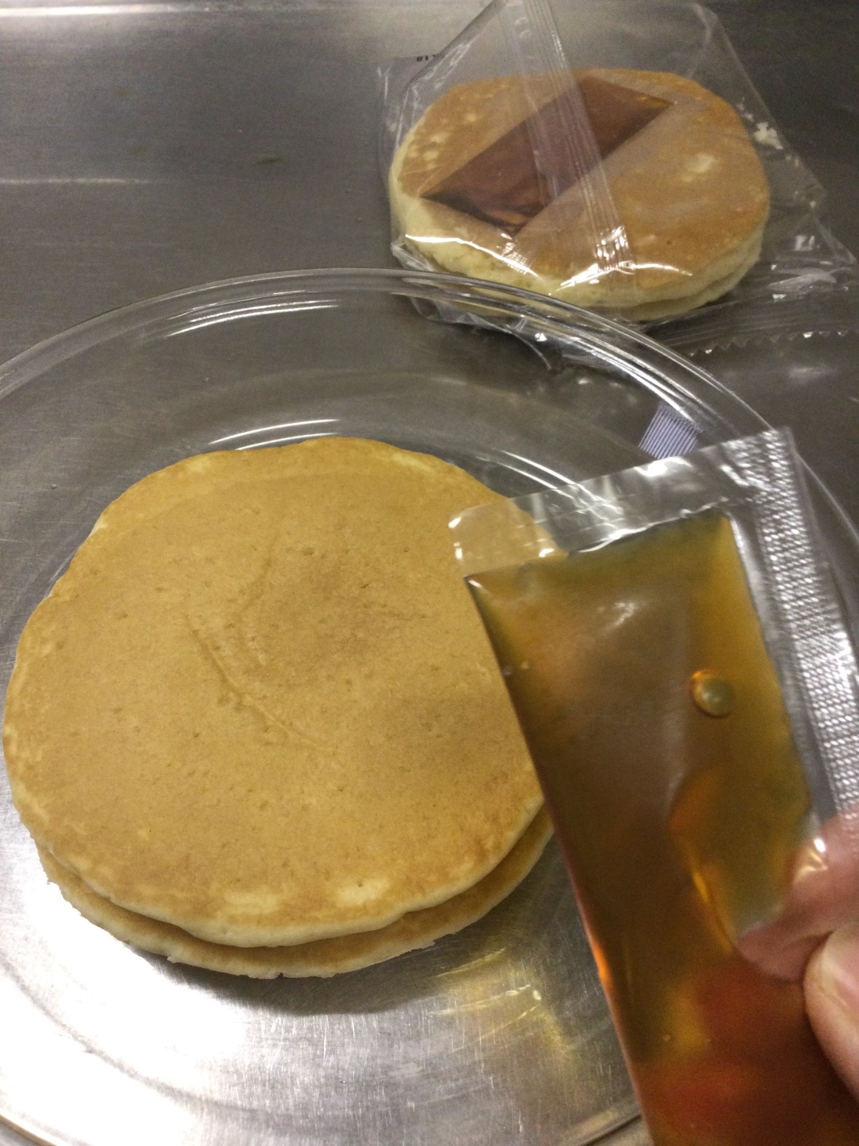 ホットケーキに付属のメープルシロップを塗ってデコレーションの準備。