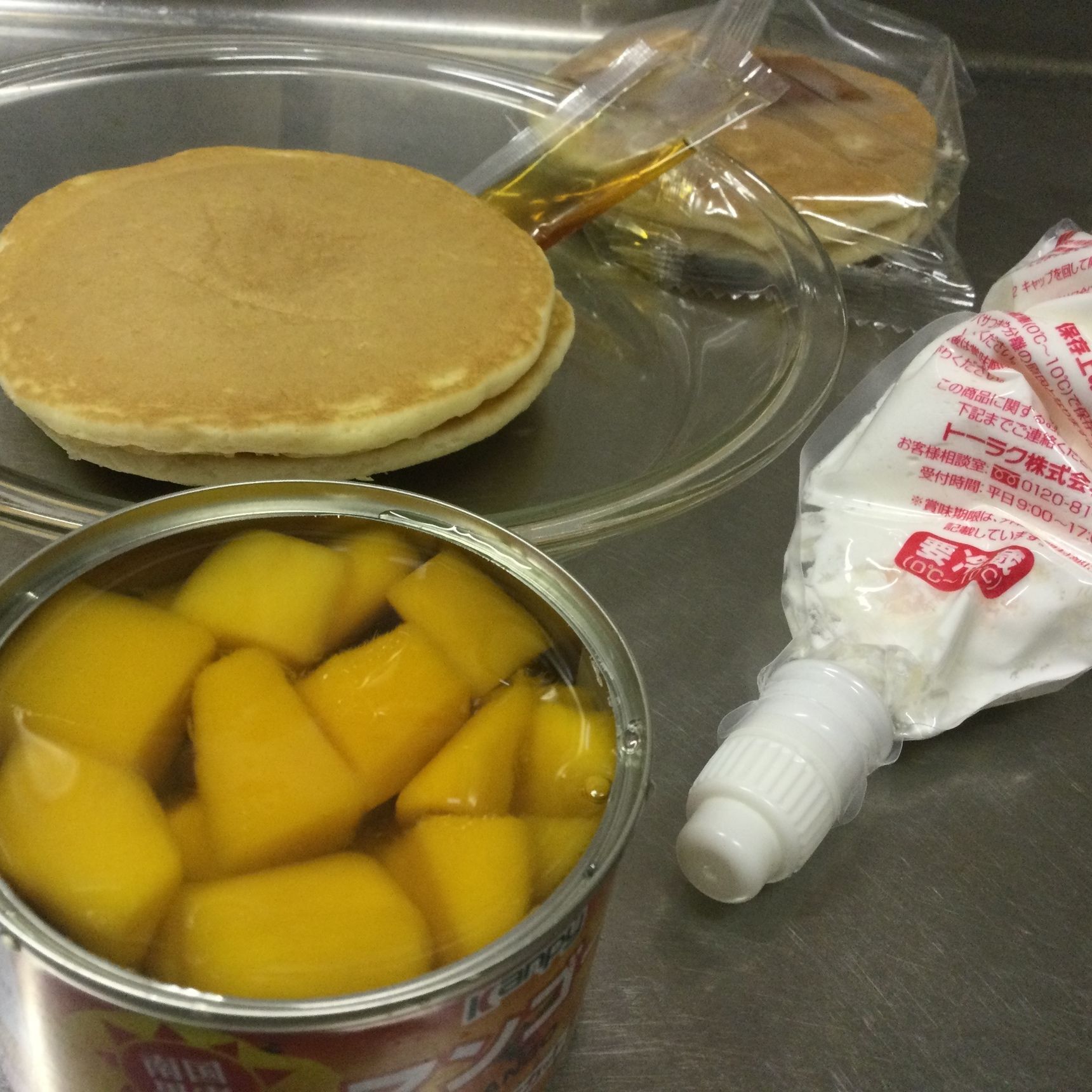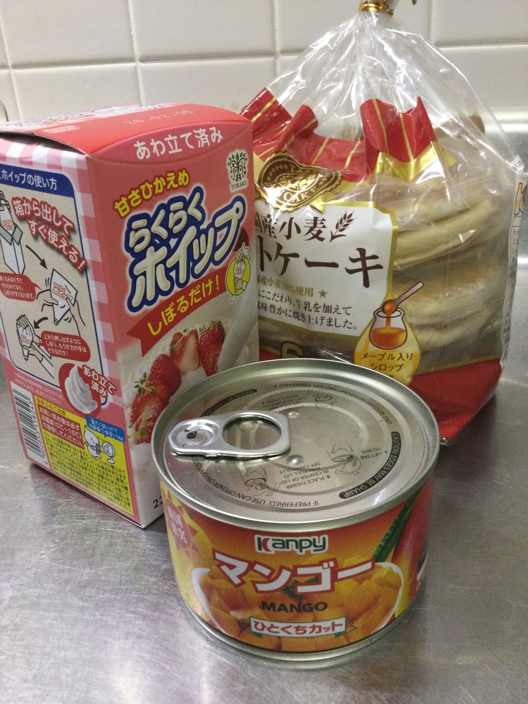 材料は3つだけ! 国産小麦ホットケーキ(キッコー製菓)、らくらくホイップ(トーラク)、マンゴー缶・ひとくちカット(タイ/kanpy)。