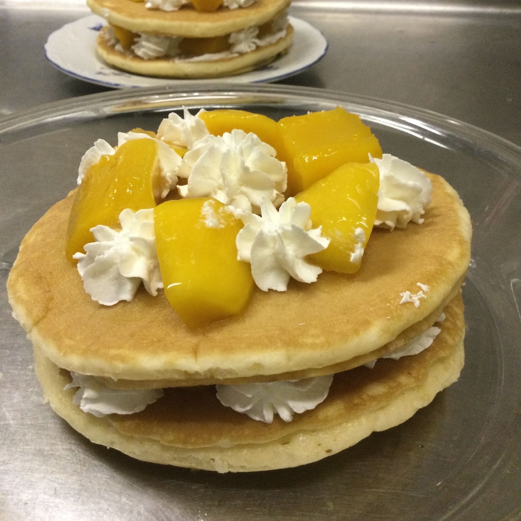 2枚目のパンケーキを重ねて、1枚目と同じようにマンゴーとホイップで飾り付け!
