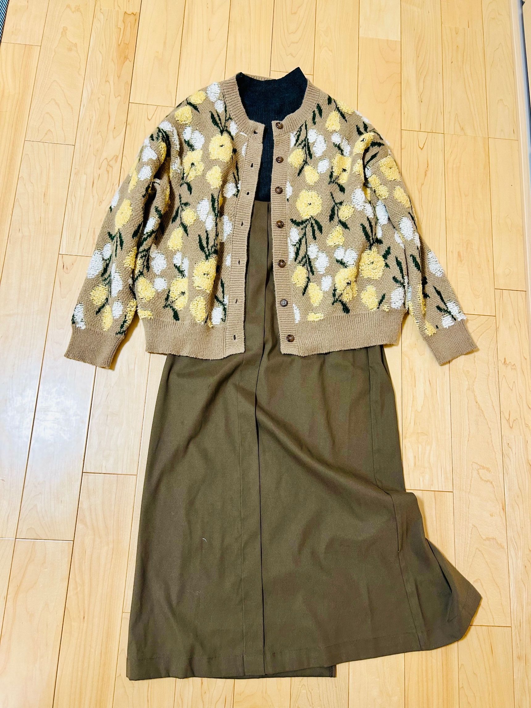シンプルなニットとワンピースなので花柄のカーディガンがとても映えます。