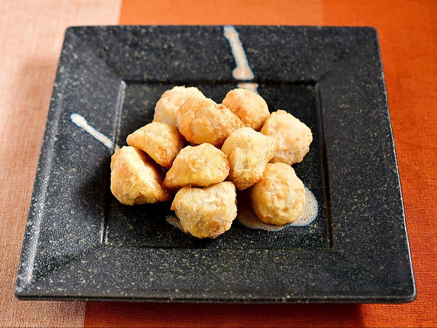里芋に米粉をまぶして、180℃の油で揚げる。