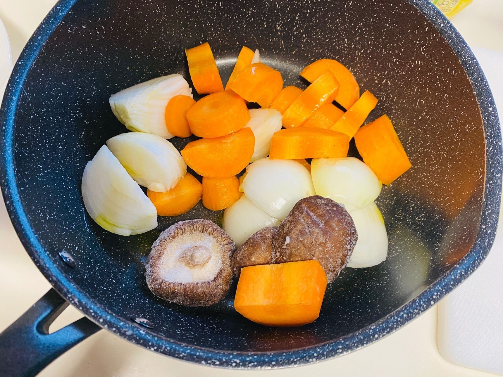お腹の空洞に詰めるものを用意します。にんじんや玉ねぎは皮を剥き厚切りします。椎茸は石づきをとったものを用意します。オリーブオイルで軽く炒めて冷まします。