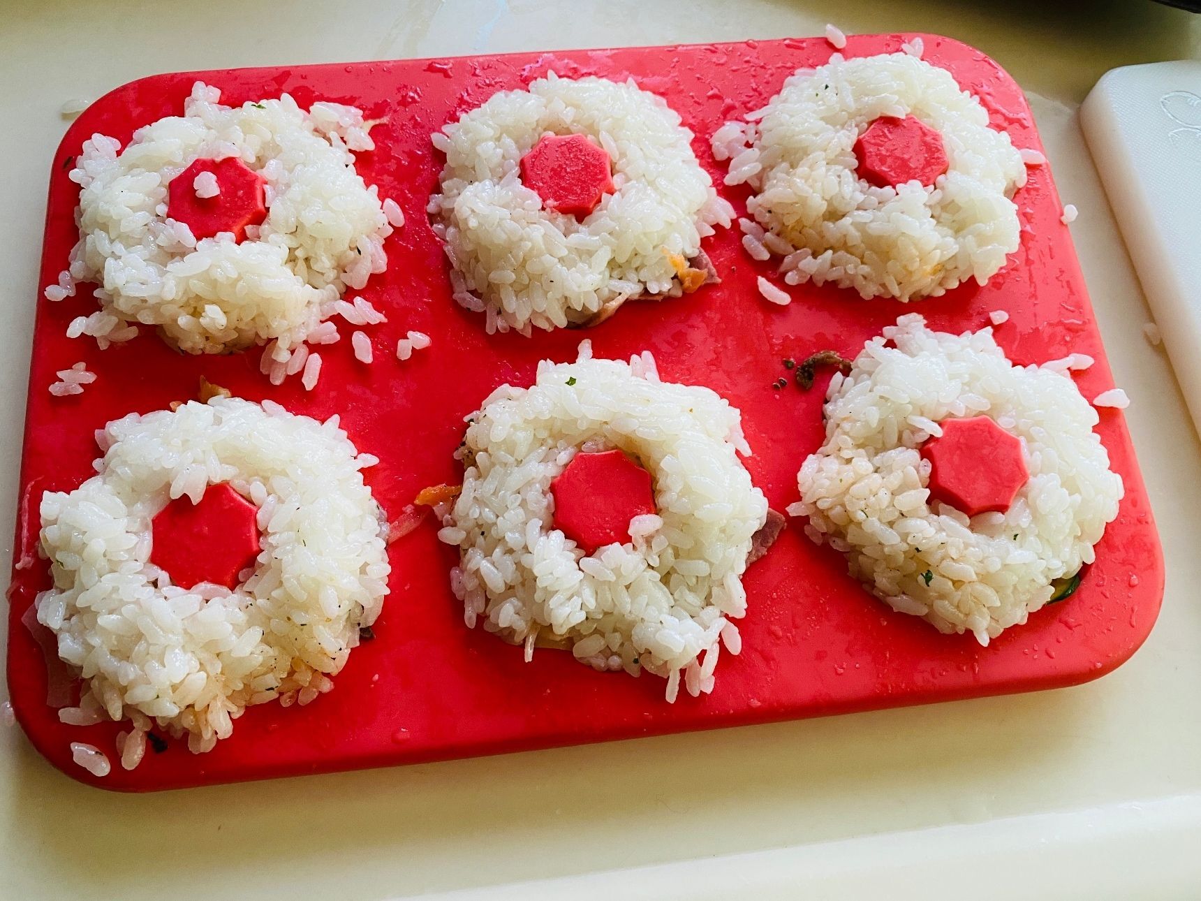 ②の酢飯をポンデリングの形に合わせて、ぎゅうぎゅうに敷き詰めます。