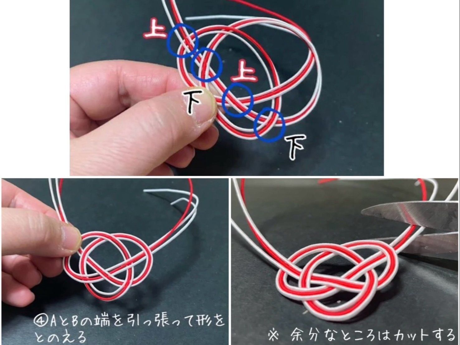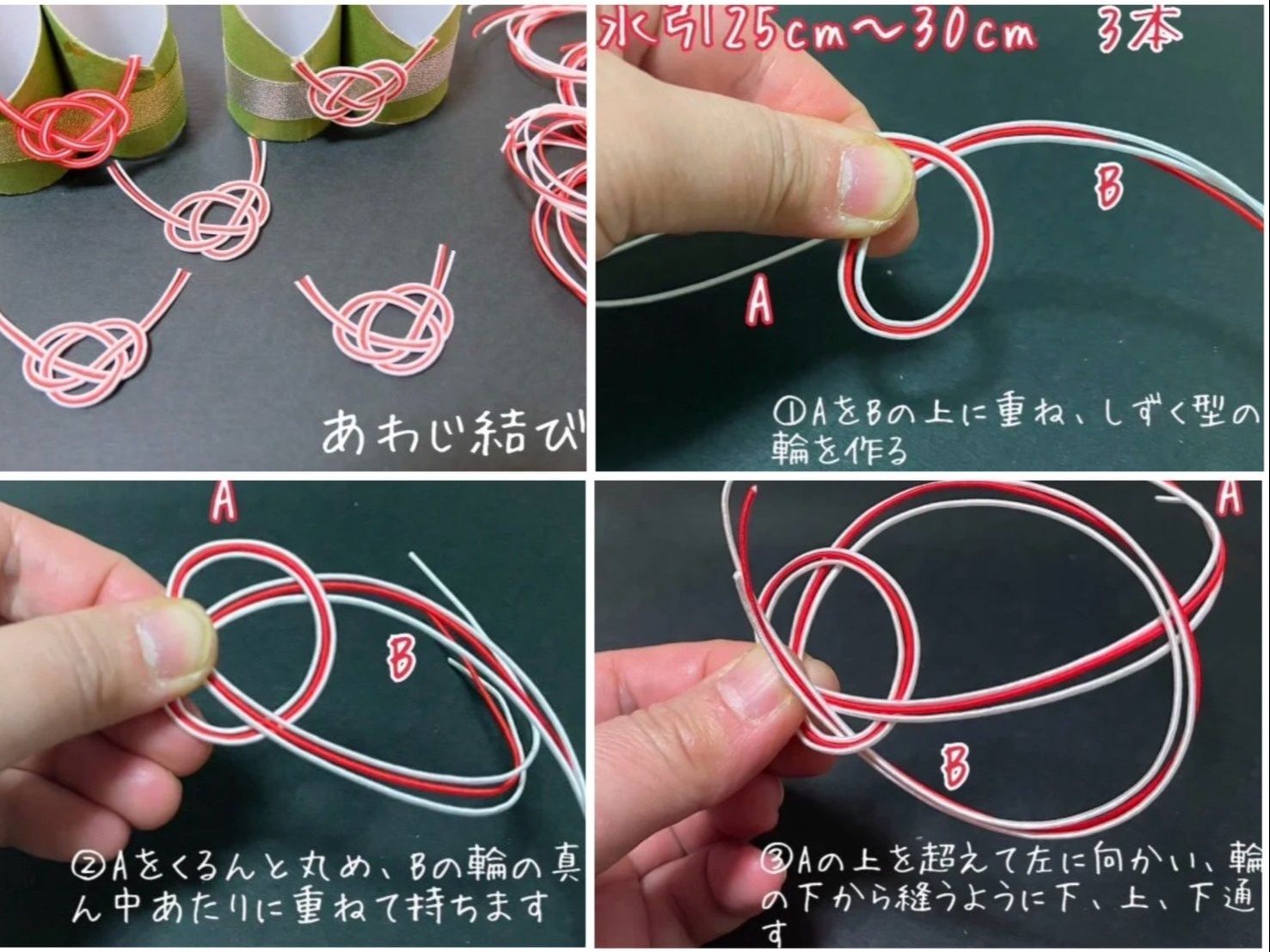 2、紅白の水引であわじ結びを作り、牛乳パックの中央に接着します。