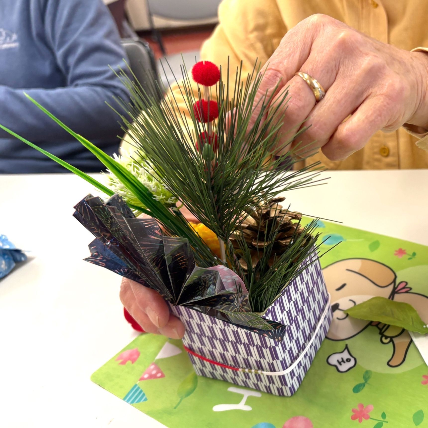 牛乳パックの土台に緩衝材を入れて、造花を刺していくだけのお正月飾り。