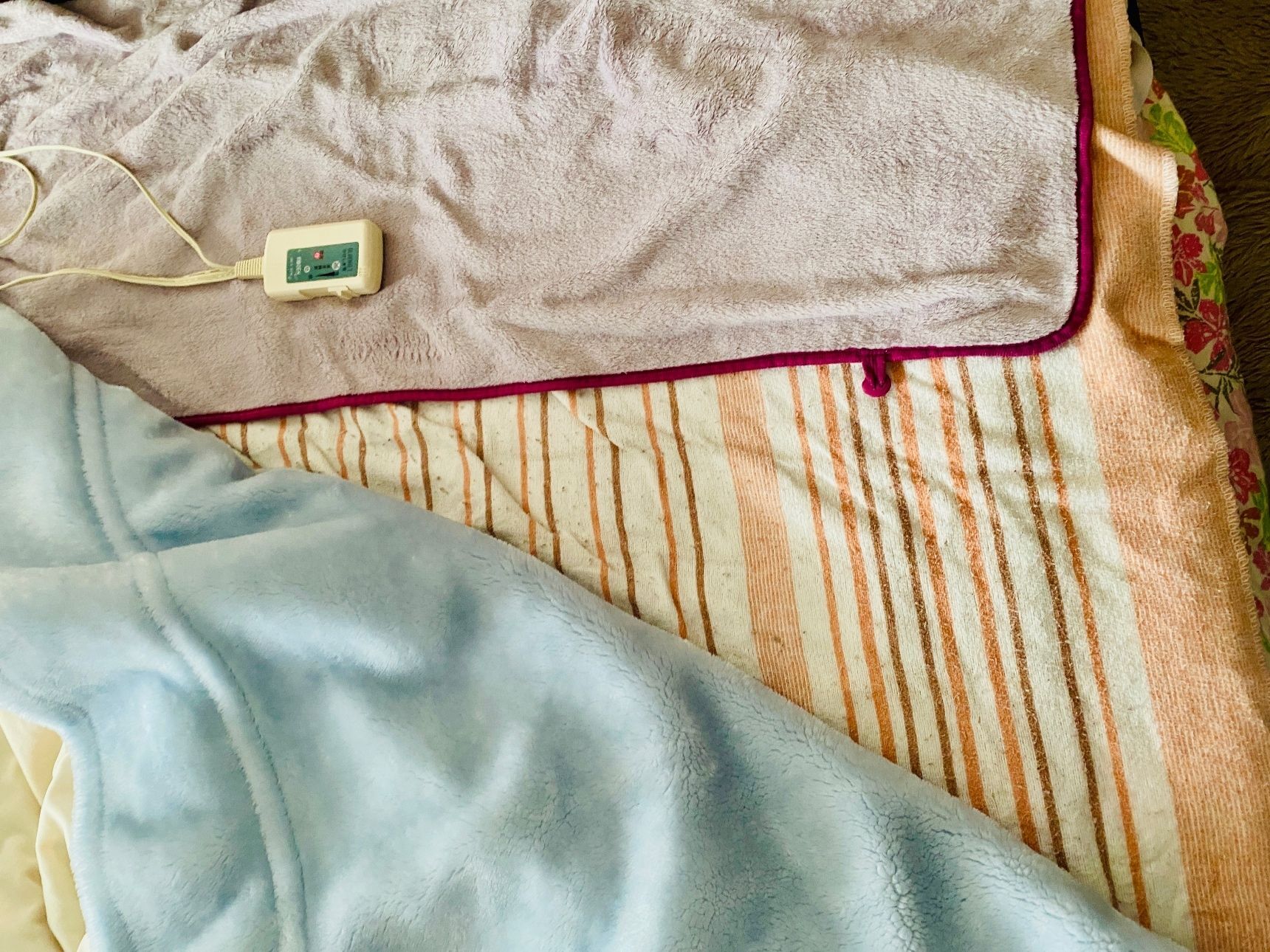 まず、カバーをかけた敷きマットの上に電気毛布を敷きます。