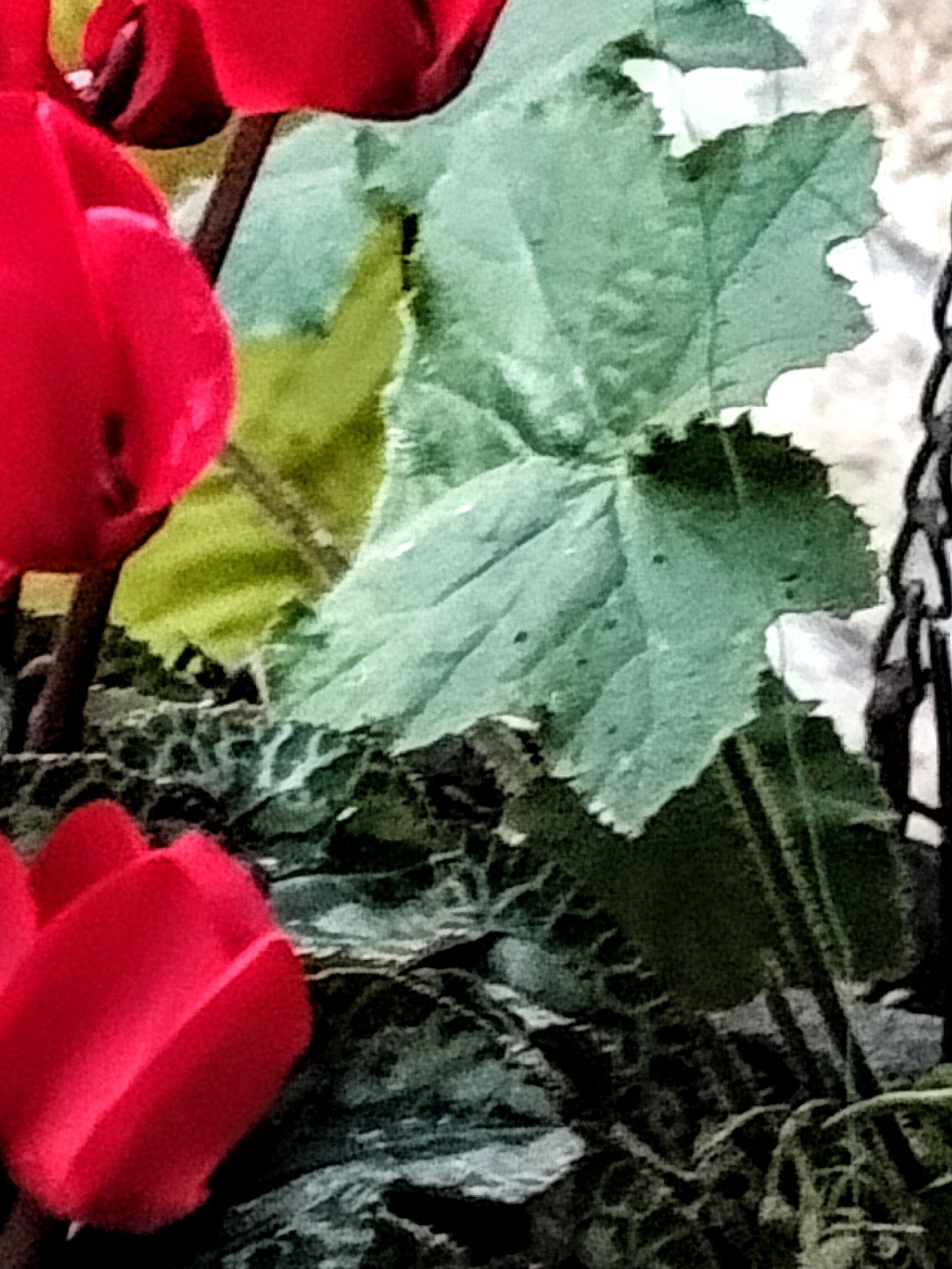2.摘んできた、ガーデンシクラメンの花とヒューケラの葉を挿すだけ〜!※適宜、水は取り替えてください!