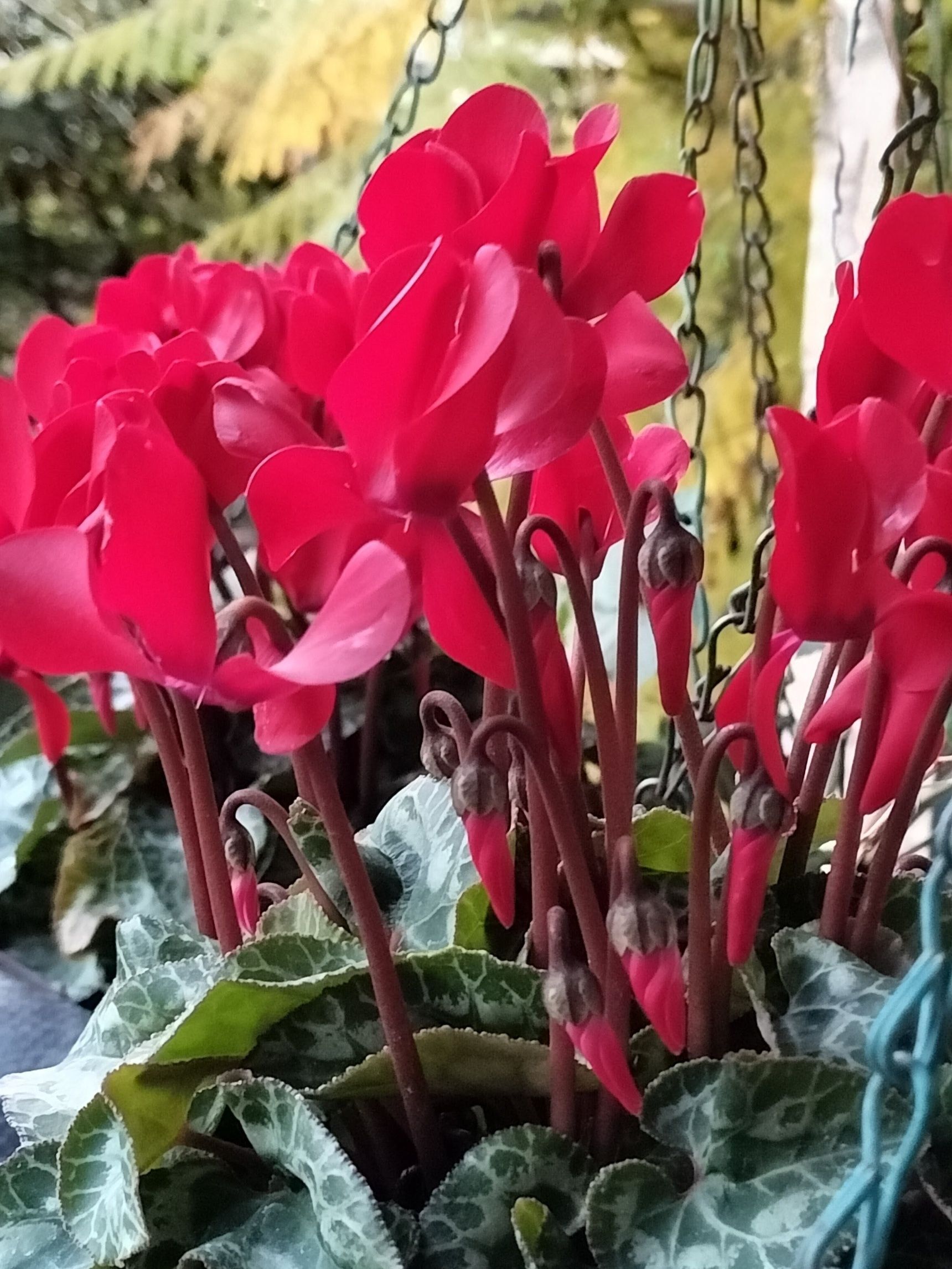 庭でガーデンシクラメンが華やかにたくさん咲いています。