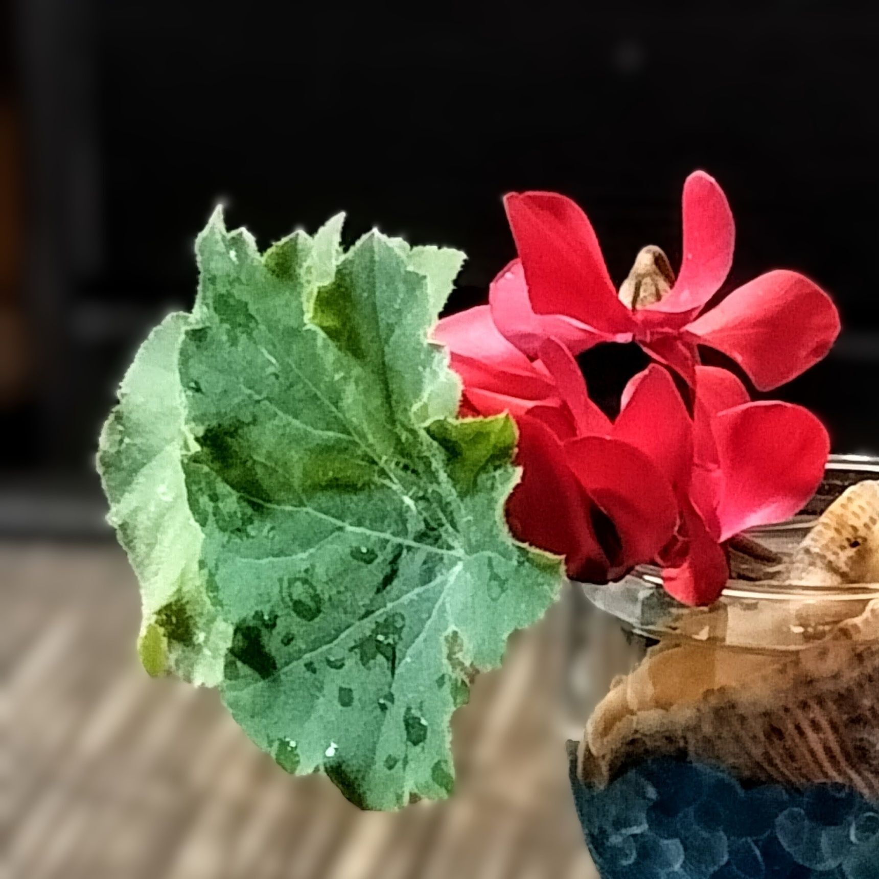 【室内でグラスに生けたガーデンシクラメン】