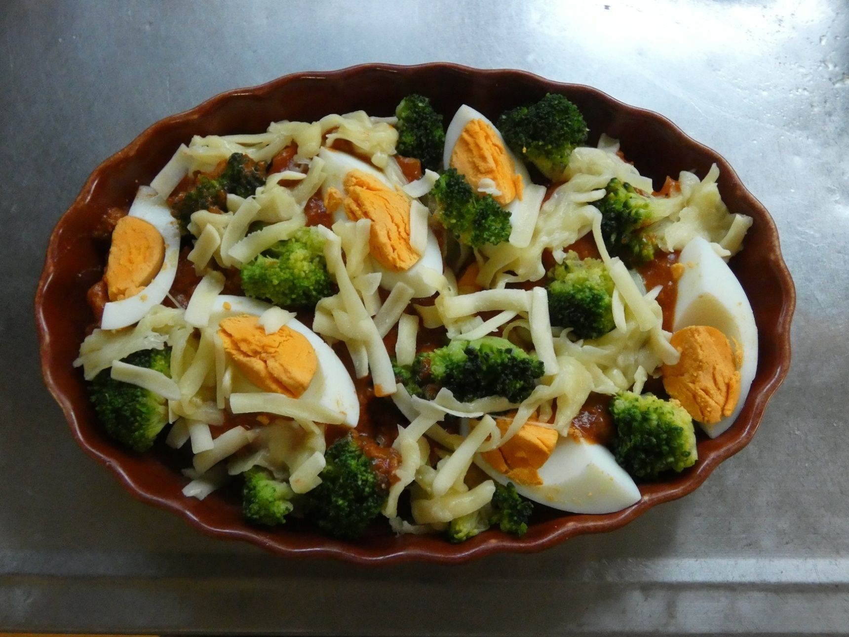 耐熱容器に厚揚げ、ブロッコリー、ゆで卵を入れます。ミートソースとピザ用チーズをかけてトースターで焼きます。