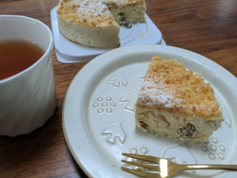 とっても濃厚でレモンの酸味が効いたチーズケーキです。レーズンとスライスアーモンドが、たっぷり入っていて食感も楽しい!