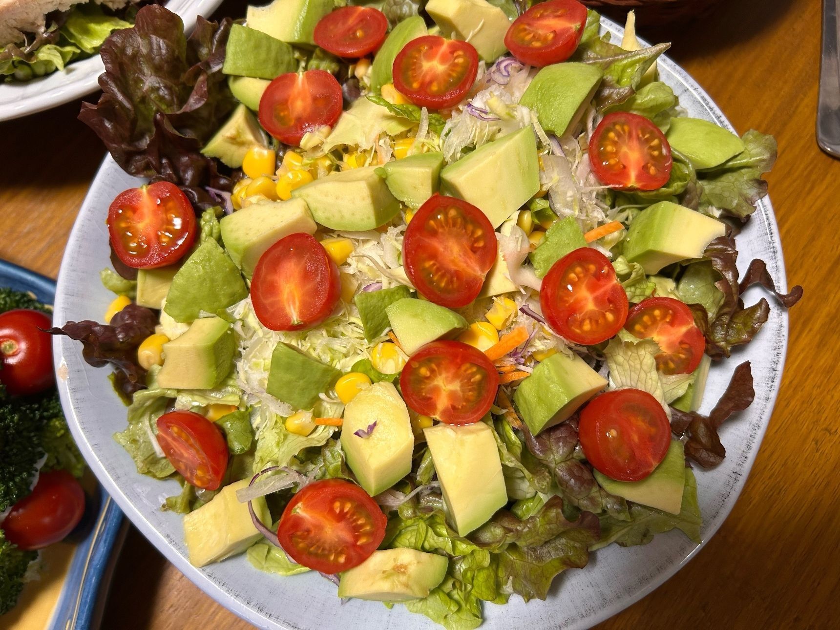 サニーレタス、千切りキャベツ、茹でブロッコリー、トマト、アボカド、コーンを盛って。