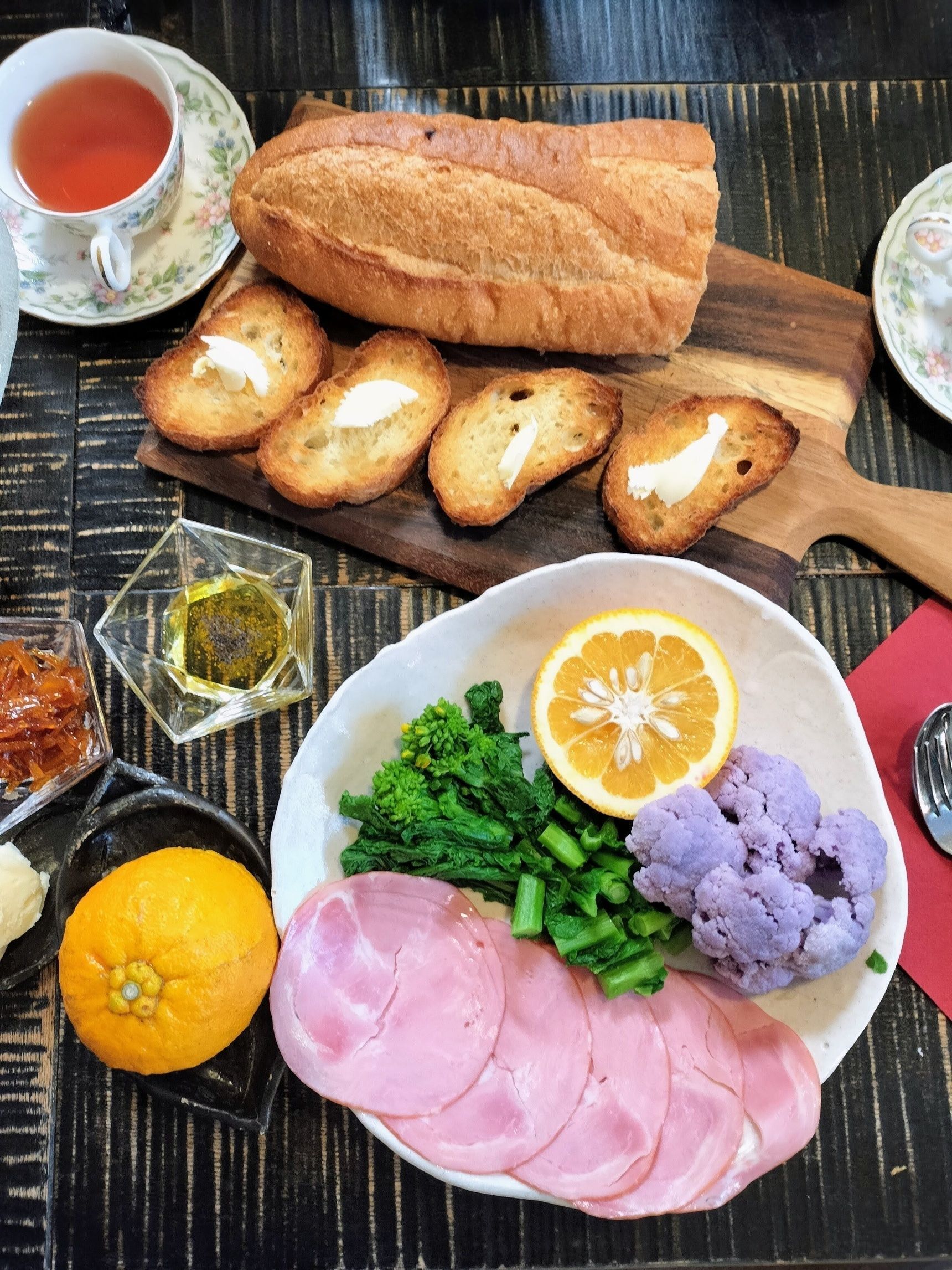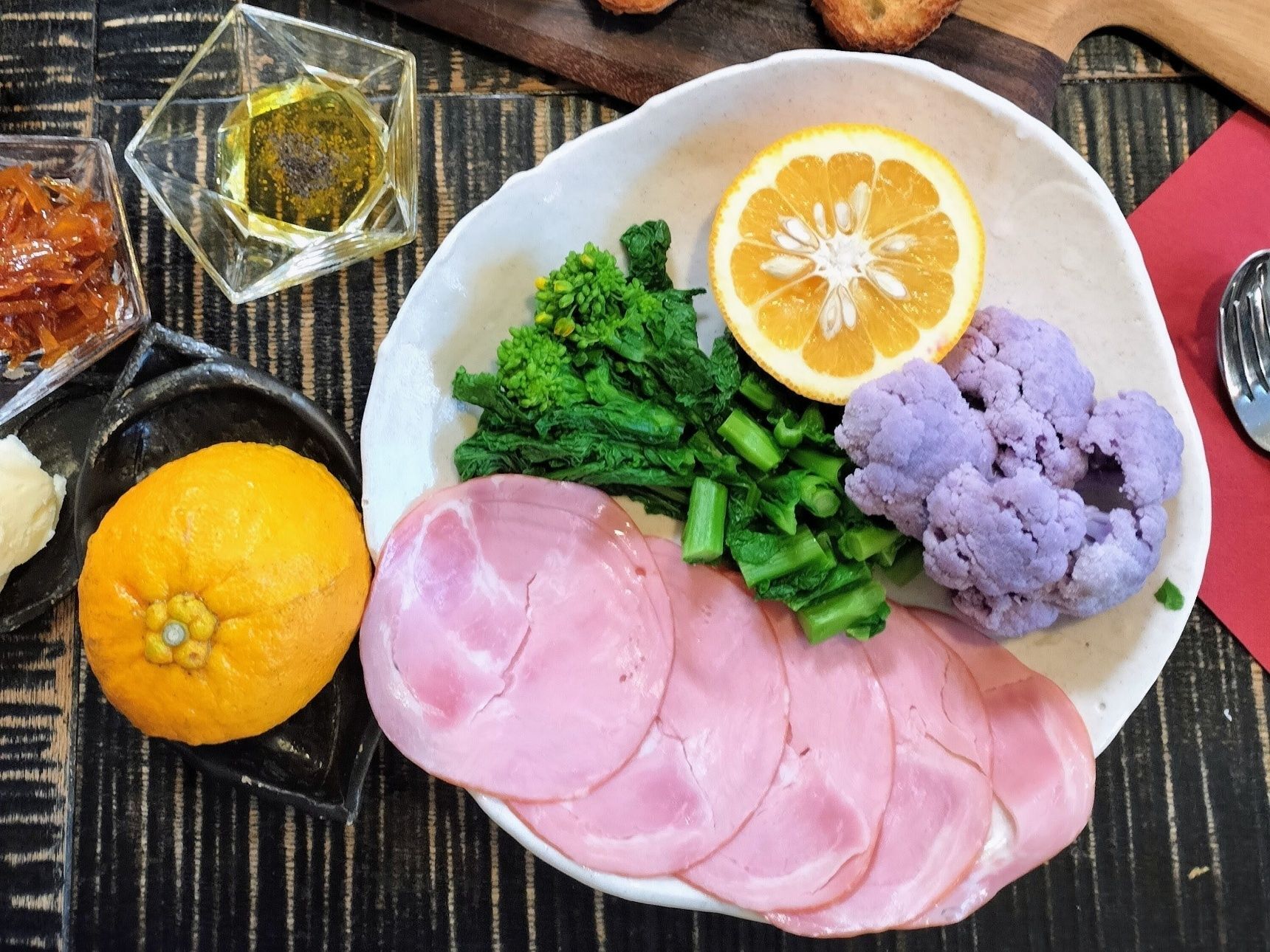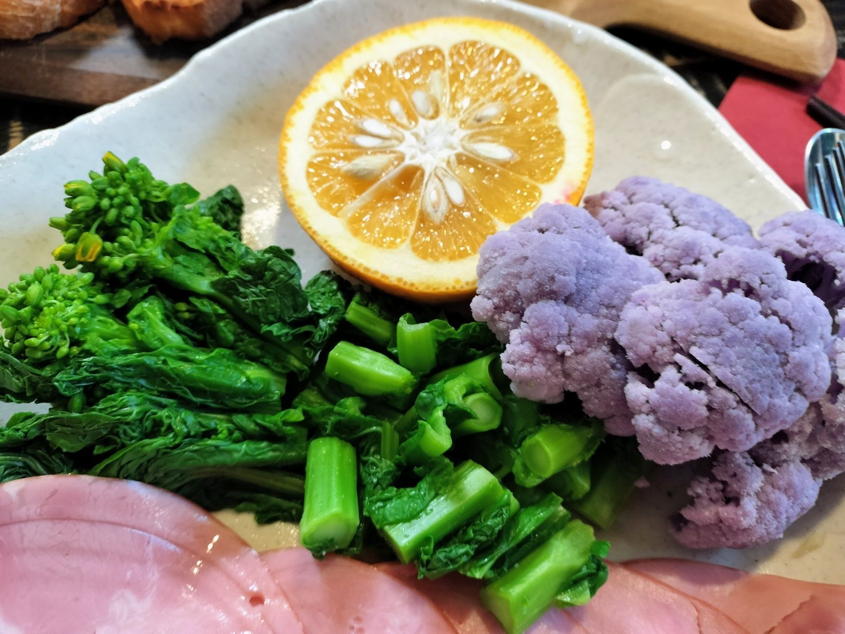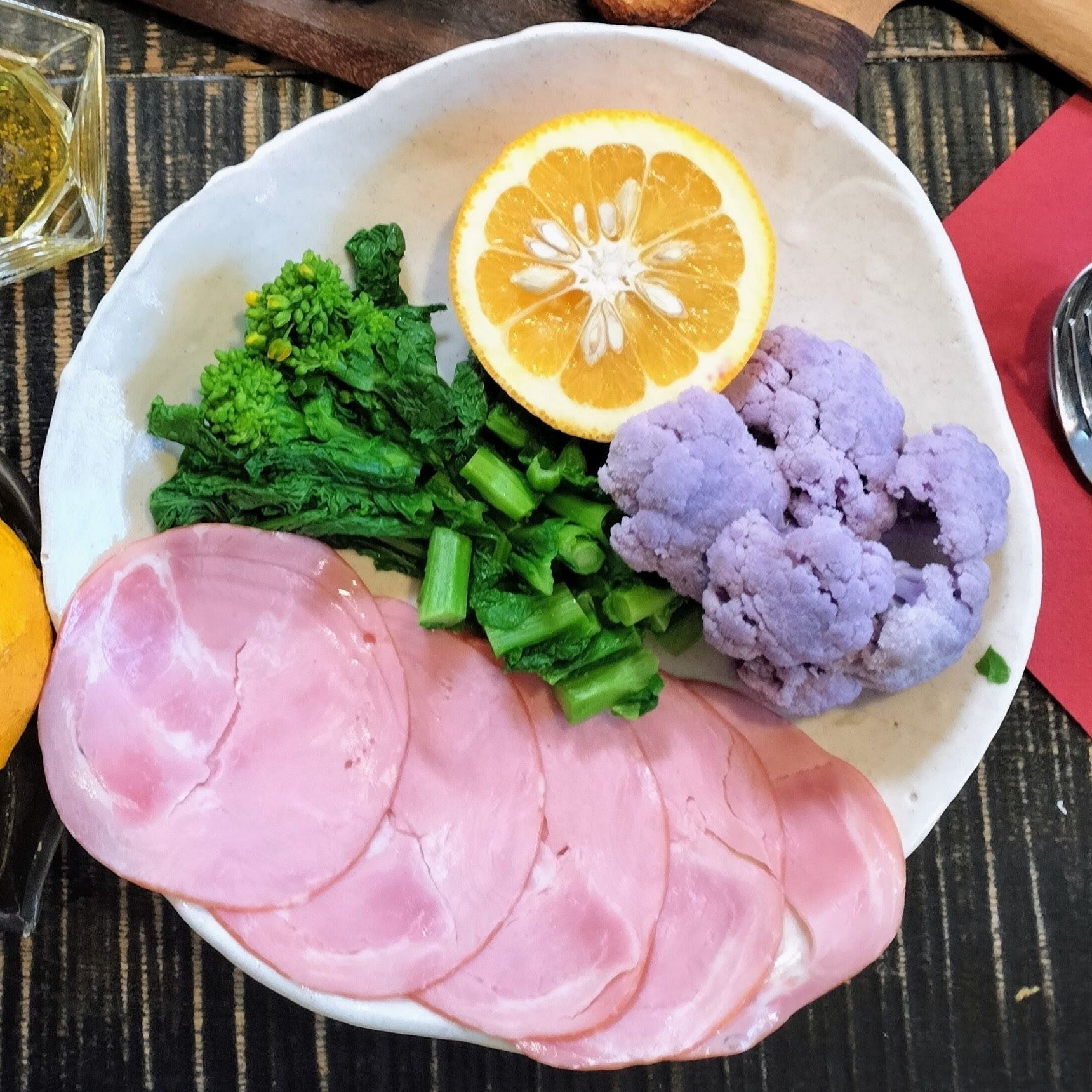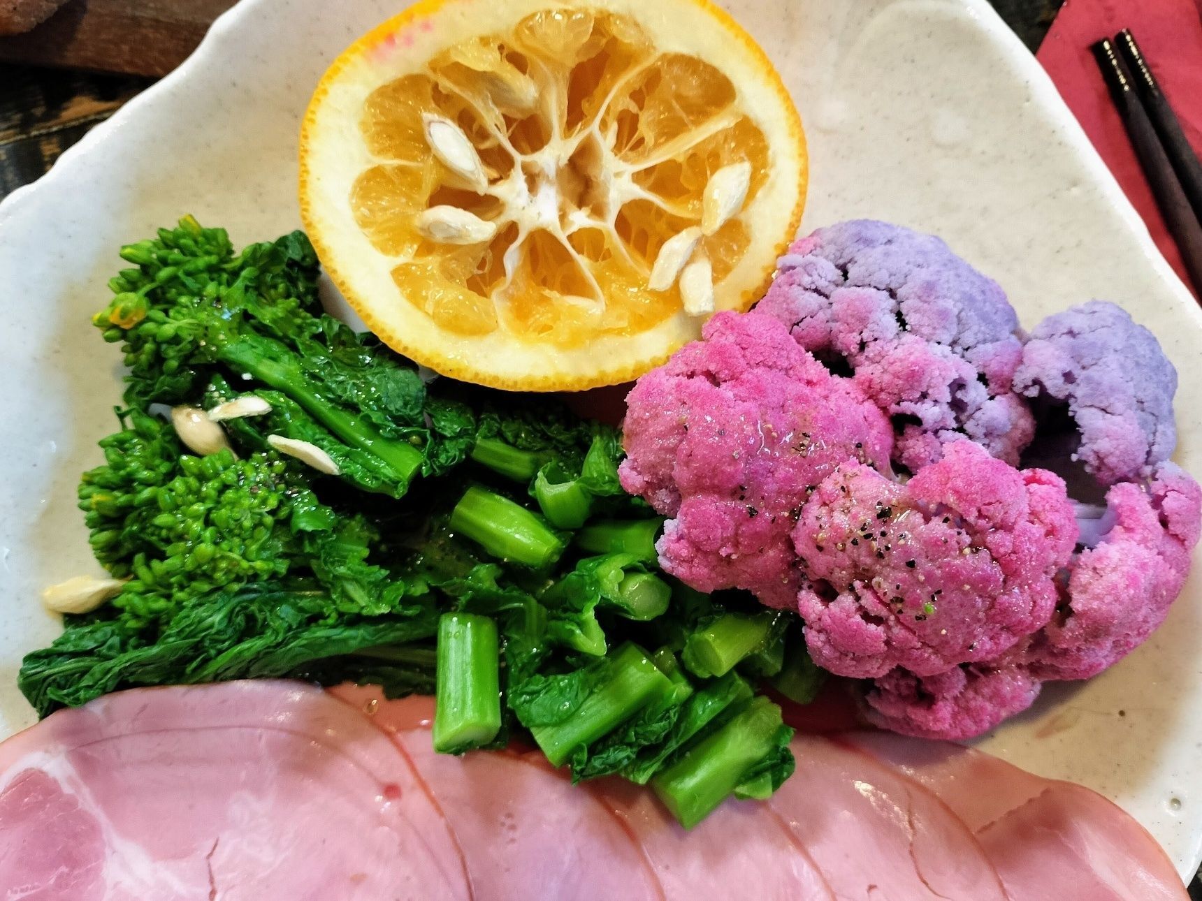 2、器に、ハム・菜花・橙・紫カリフラワーを盛り付ける