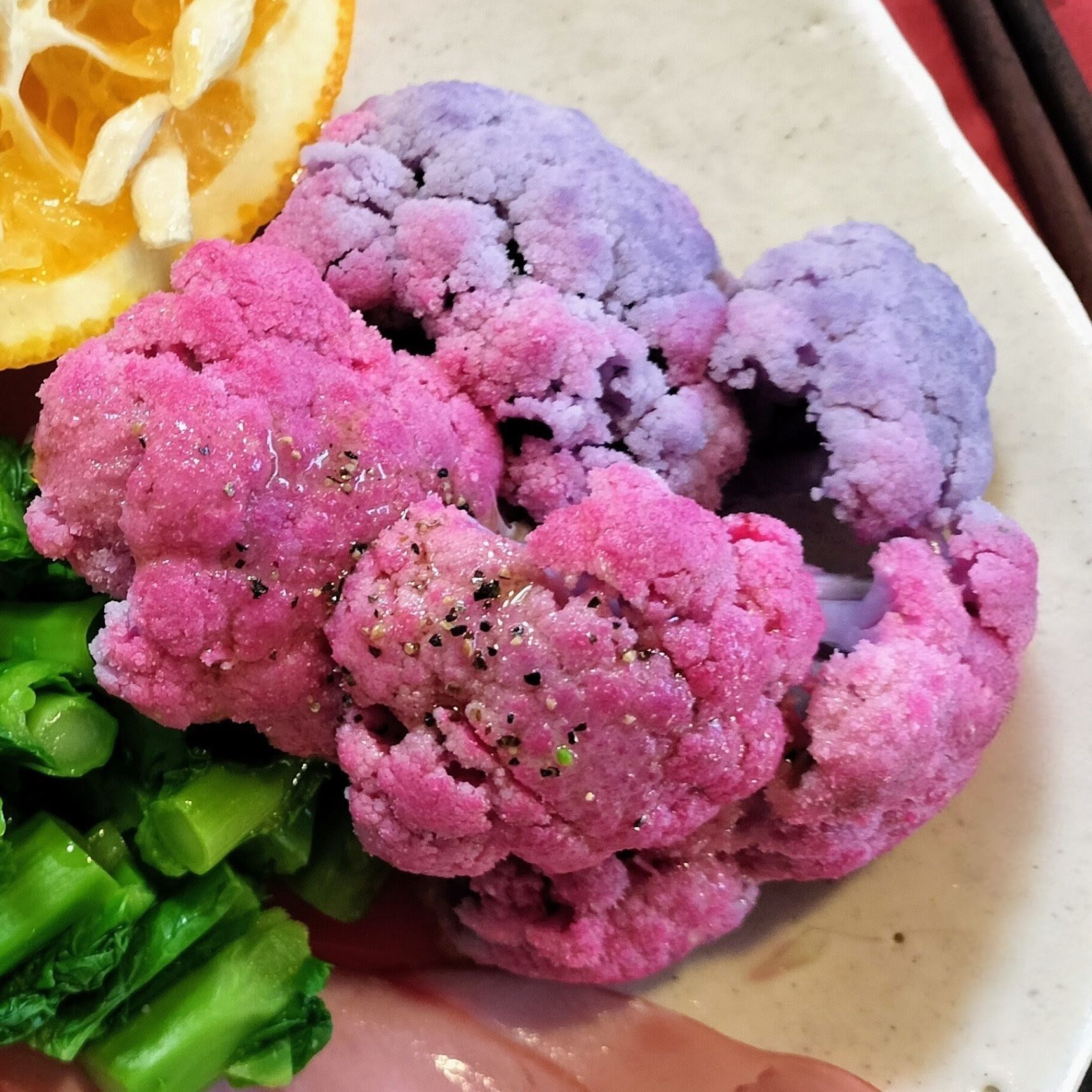 各自、橙をかけると薄紫と赤紫のグラデーションを楽しめます!紫カリフラワーと菜花のサラダ!