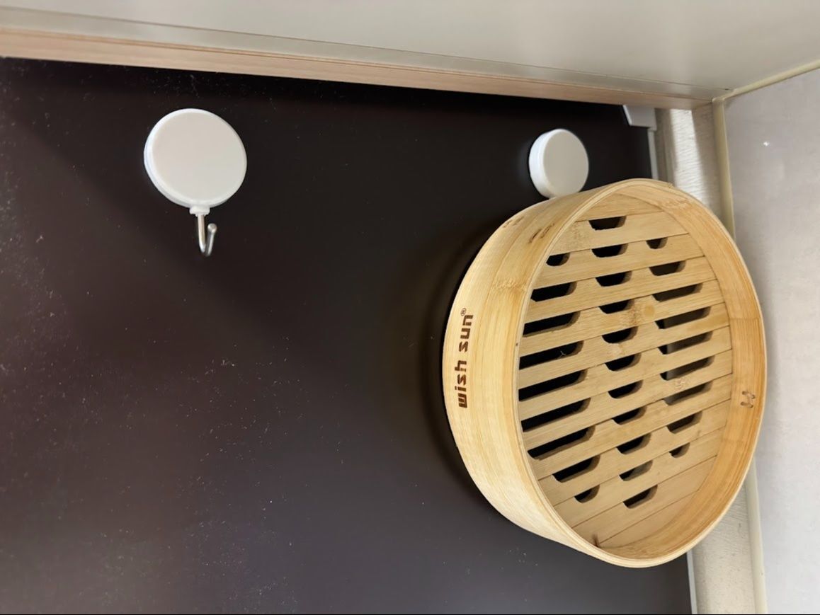 使用後は洗剤は使わず、お湯で濡らした布巾で汚れを拭き取ります。風通しの良い場所で、本体とフタを分けて立てかけて陰干しします。湿気はカビの元です。私は100均のマグネットフックを使って冷蔵庫横に吊るしています。