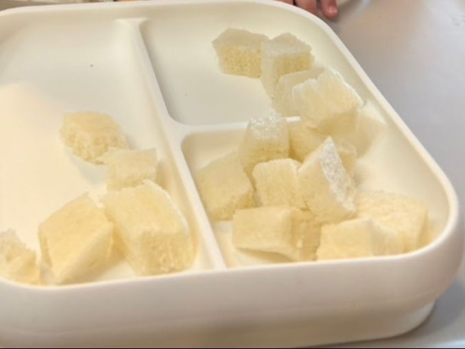 孫が遊びに来ると食パンを細かく切って離乳食で食べさせる事があります。それでパンの耳が余ります。