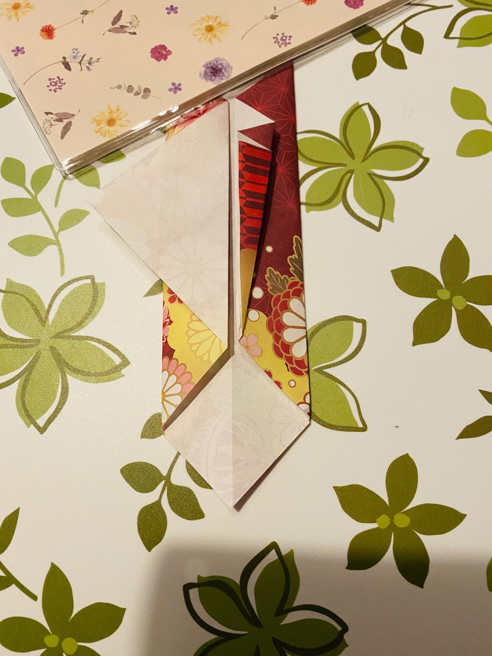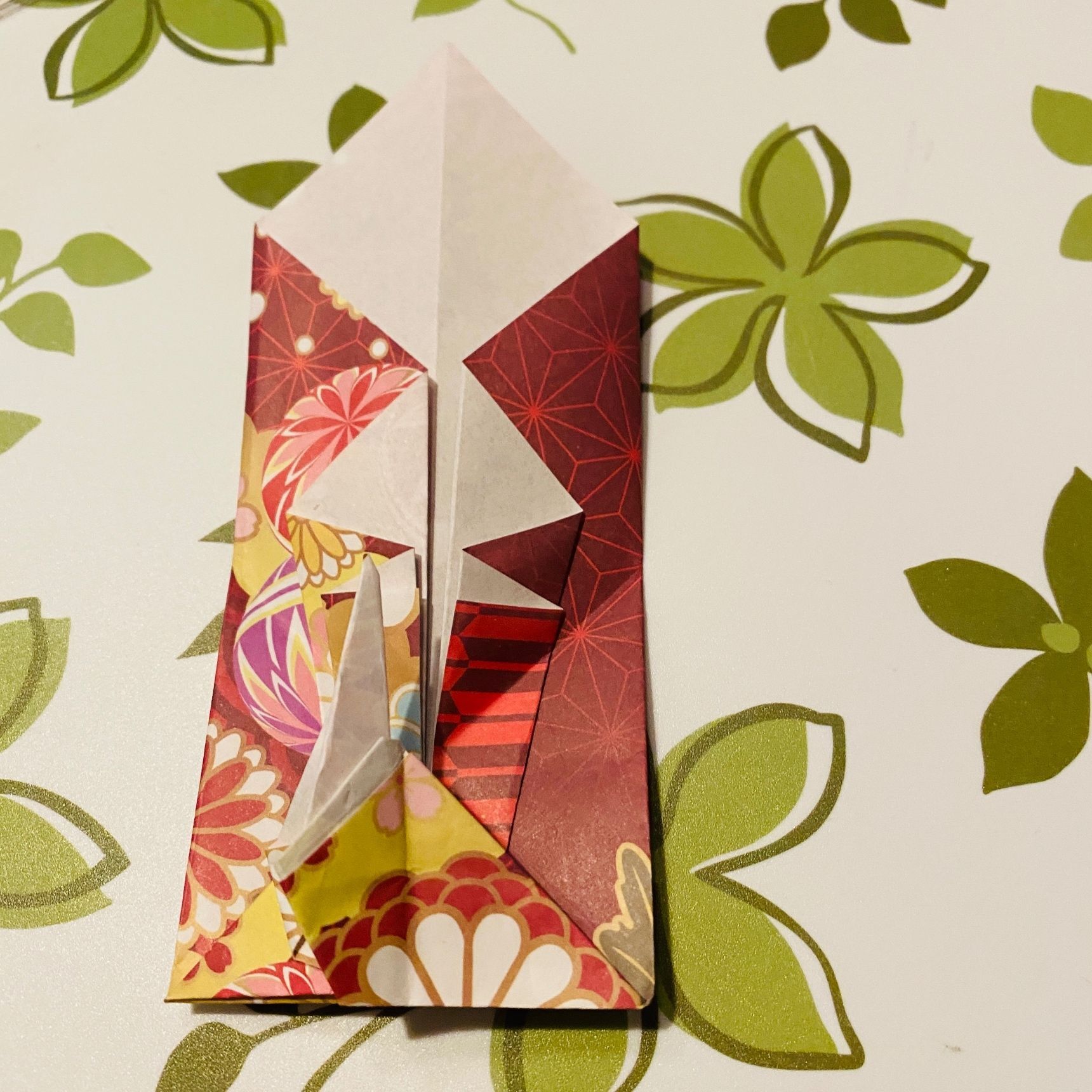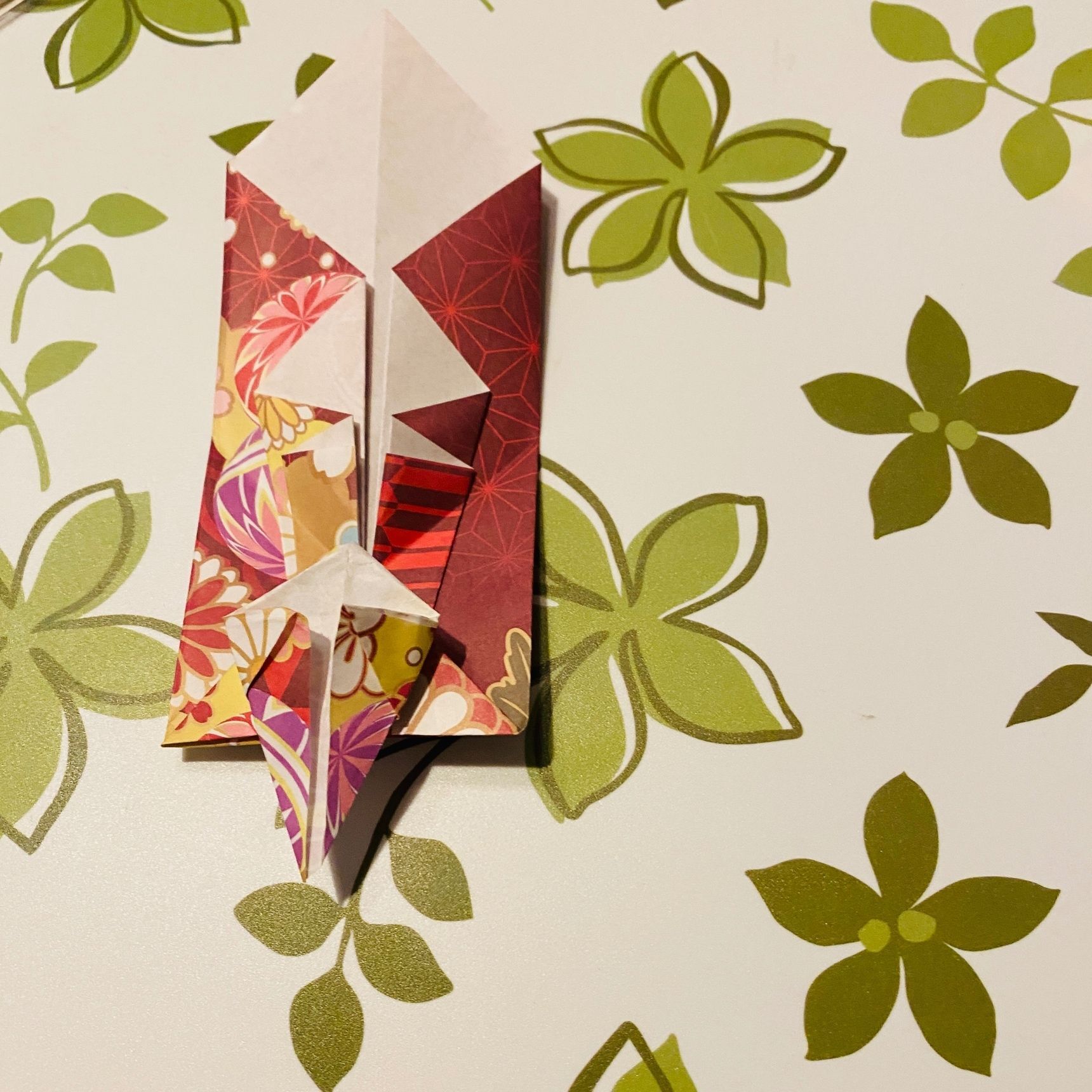 開いて、鶴のあしのように折り、右側から左側へ重ねます。