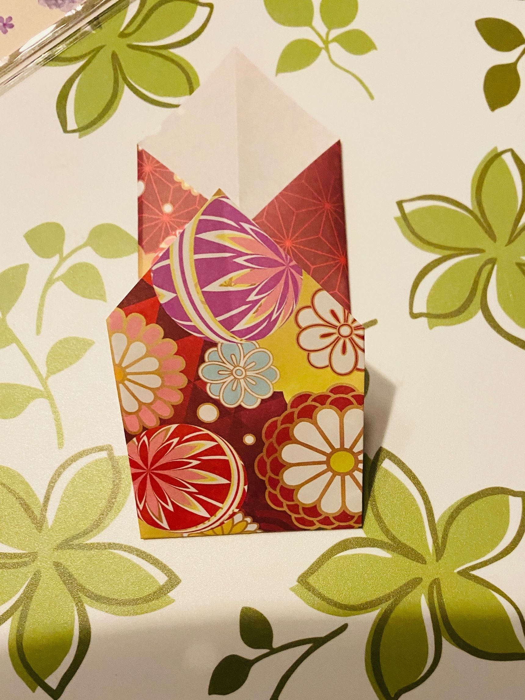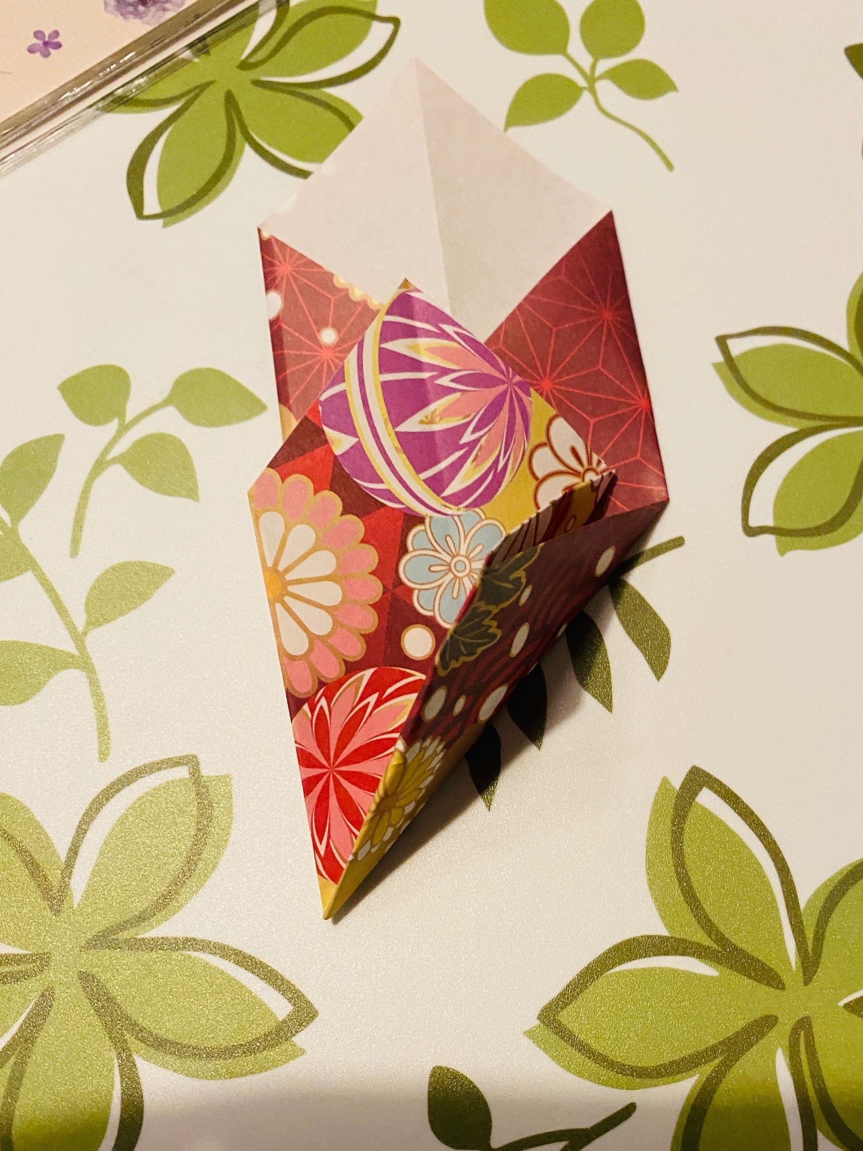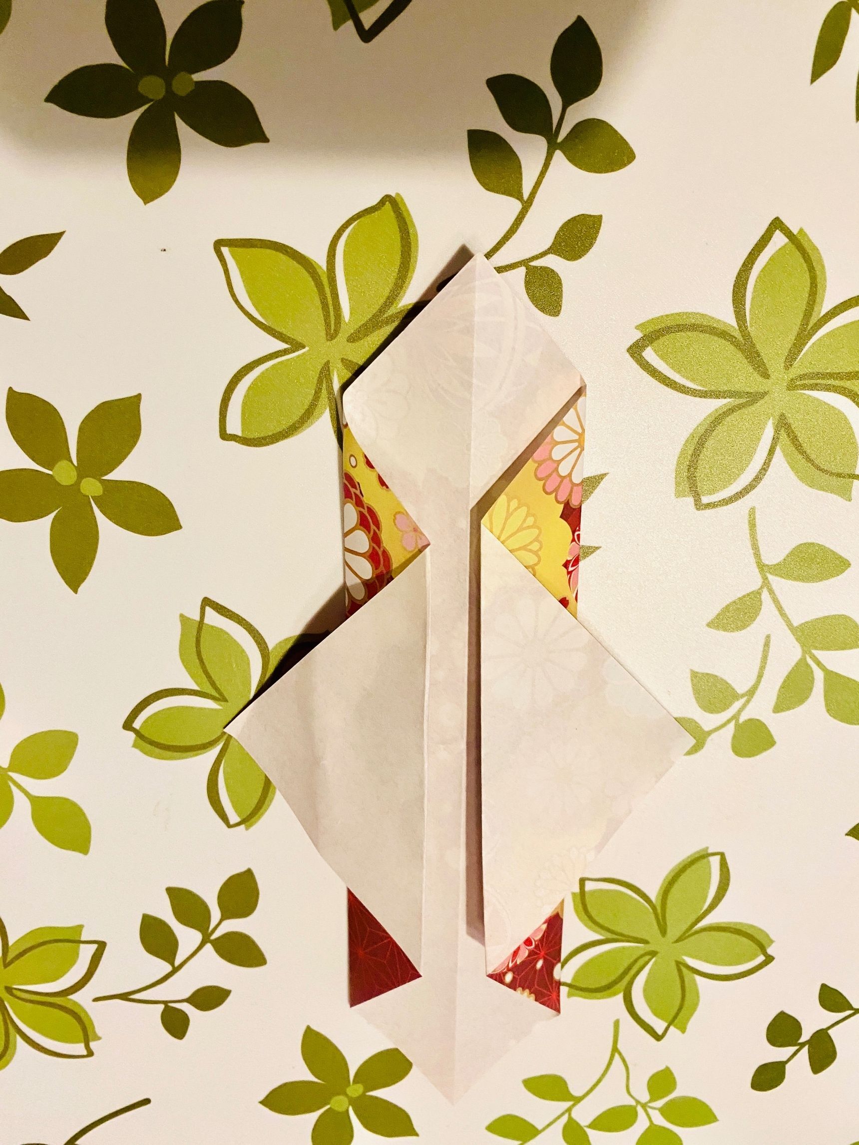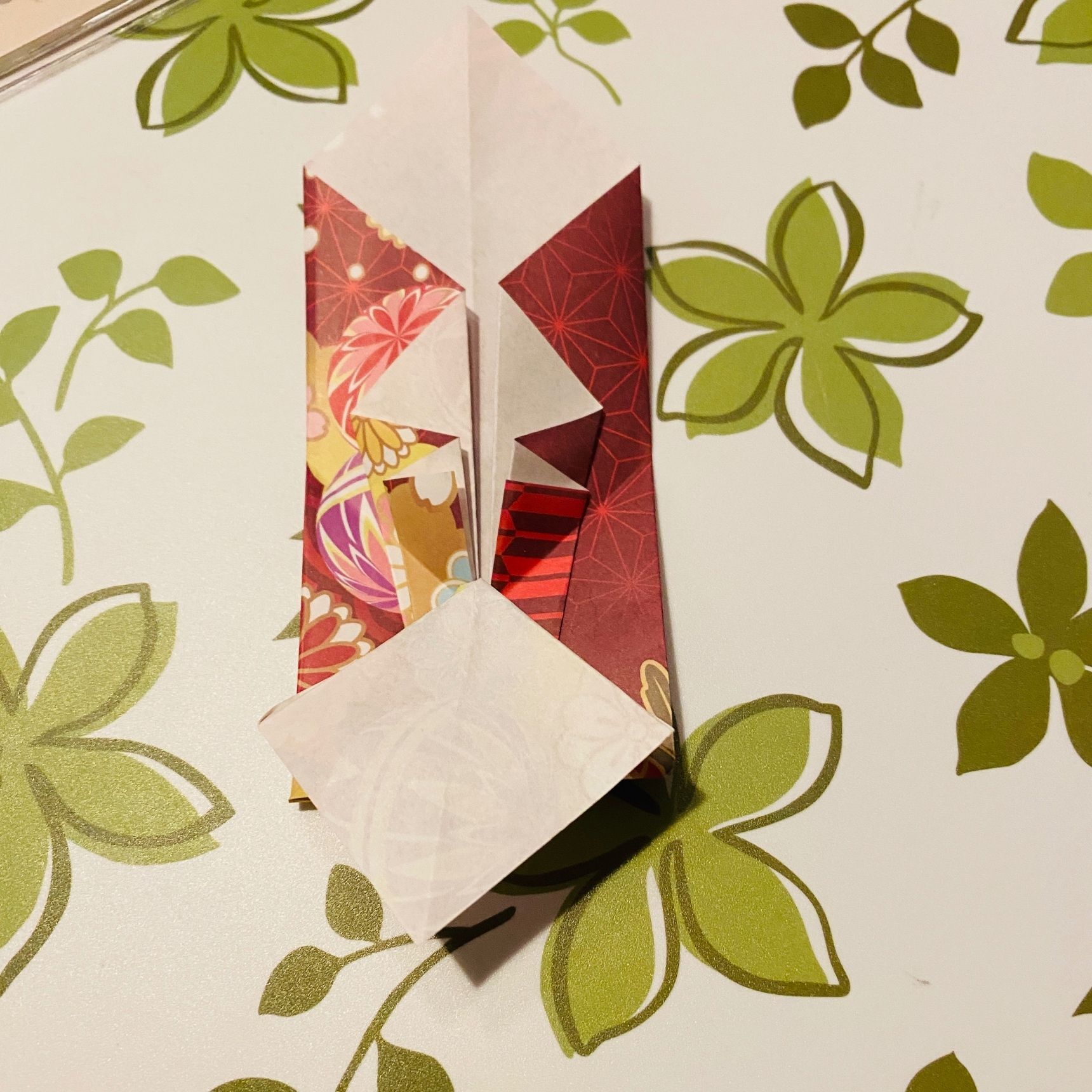 三角に折ります。中心線に合わせて、写真のように折ります。
