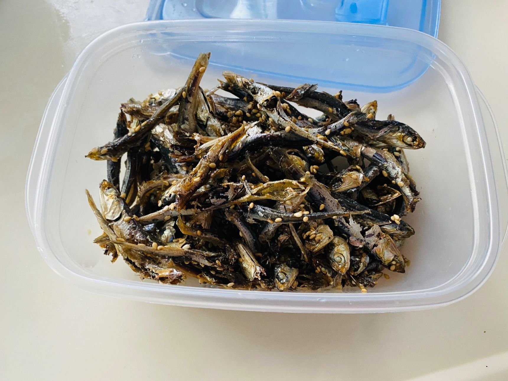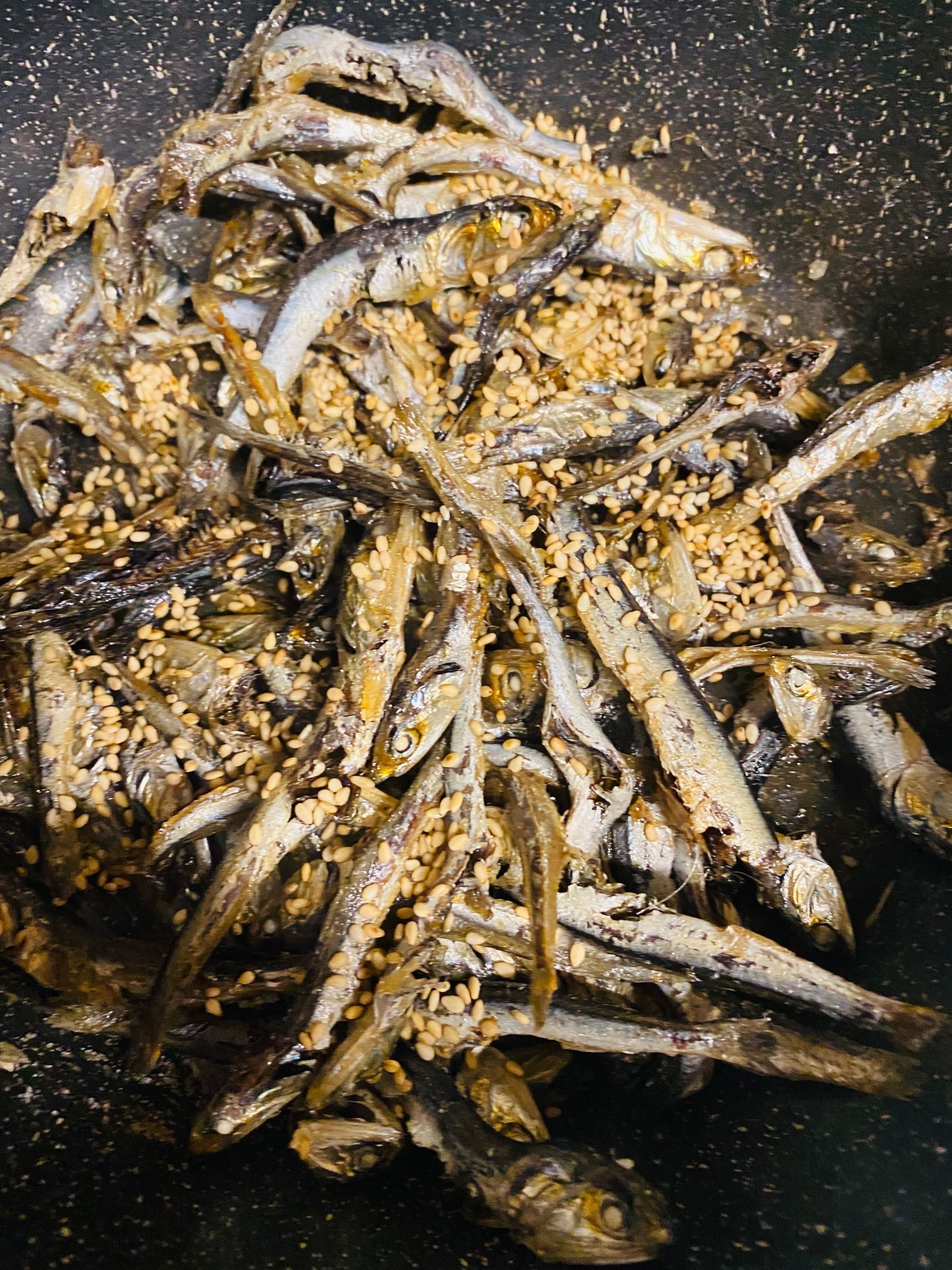 フライパンを温め、煮干しを入れて、酒を3回に分けて炒ります。