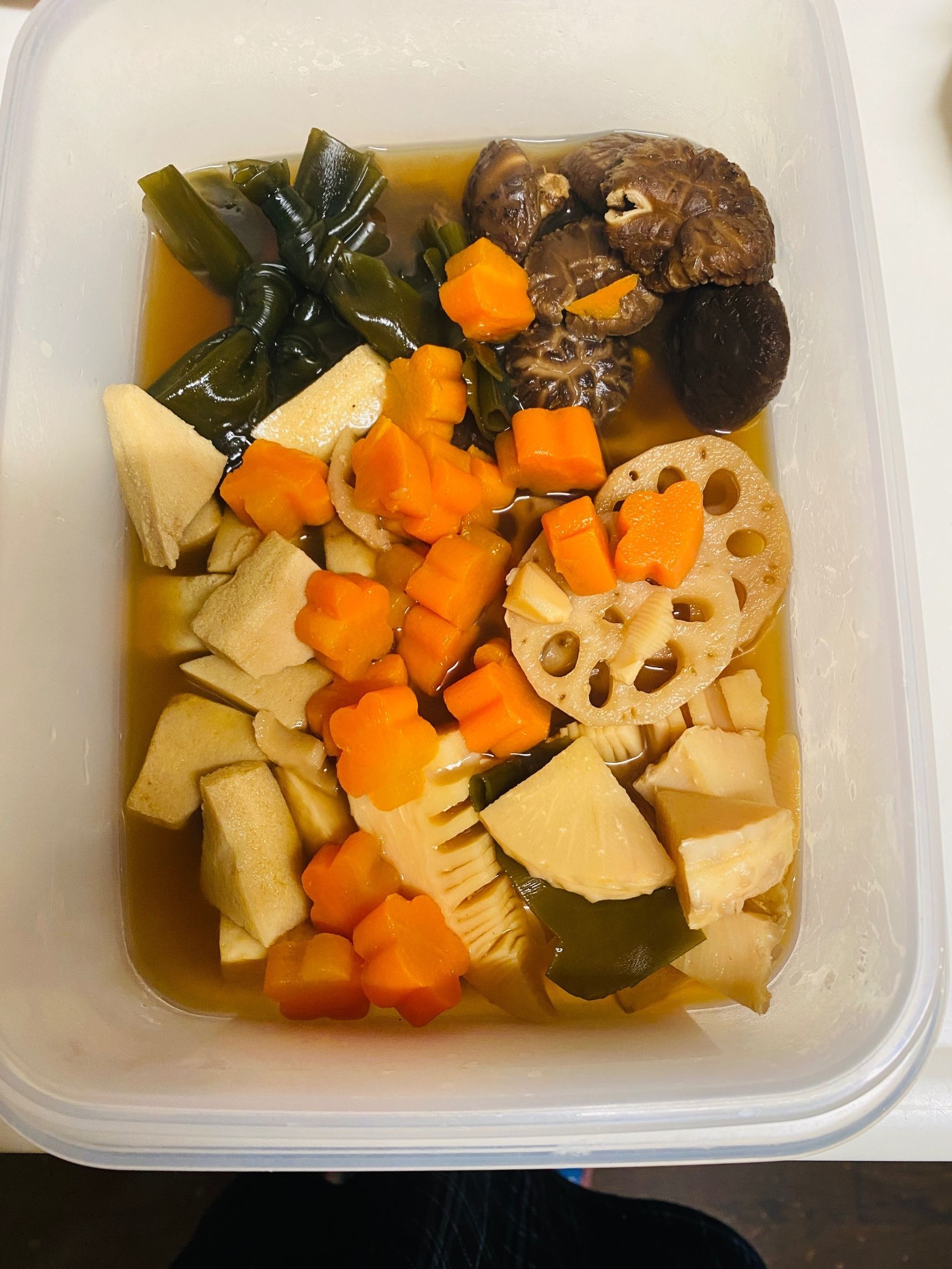 ②鍋に人参、筍、干し椎茸、蓮根、結び昆布を入れます。