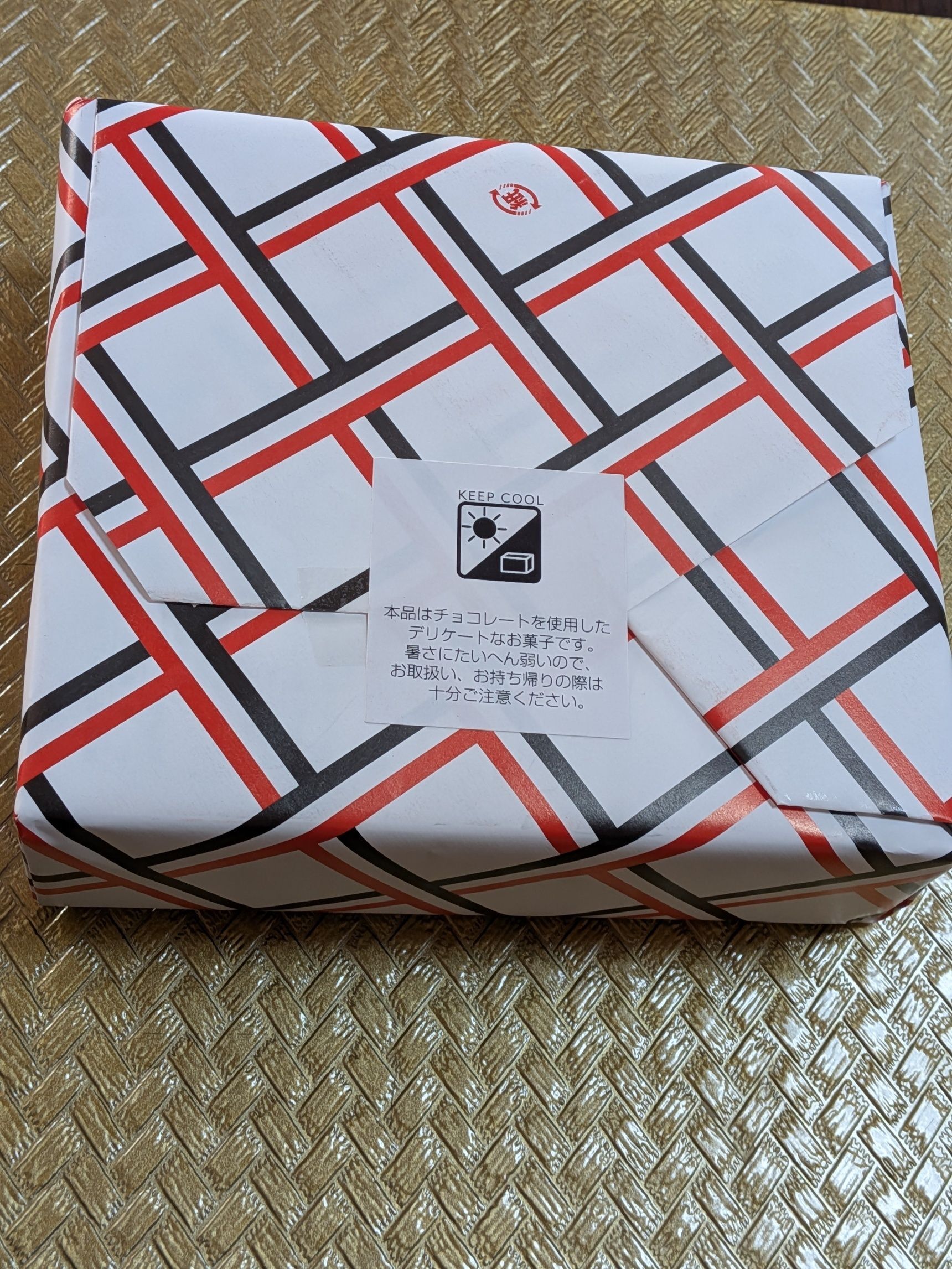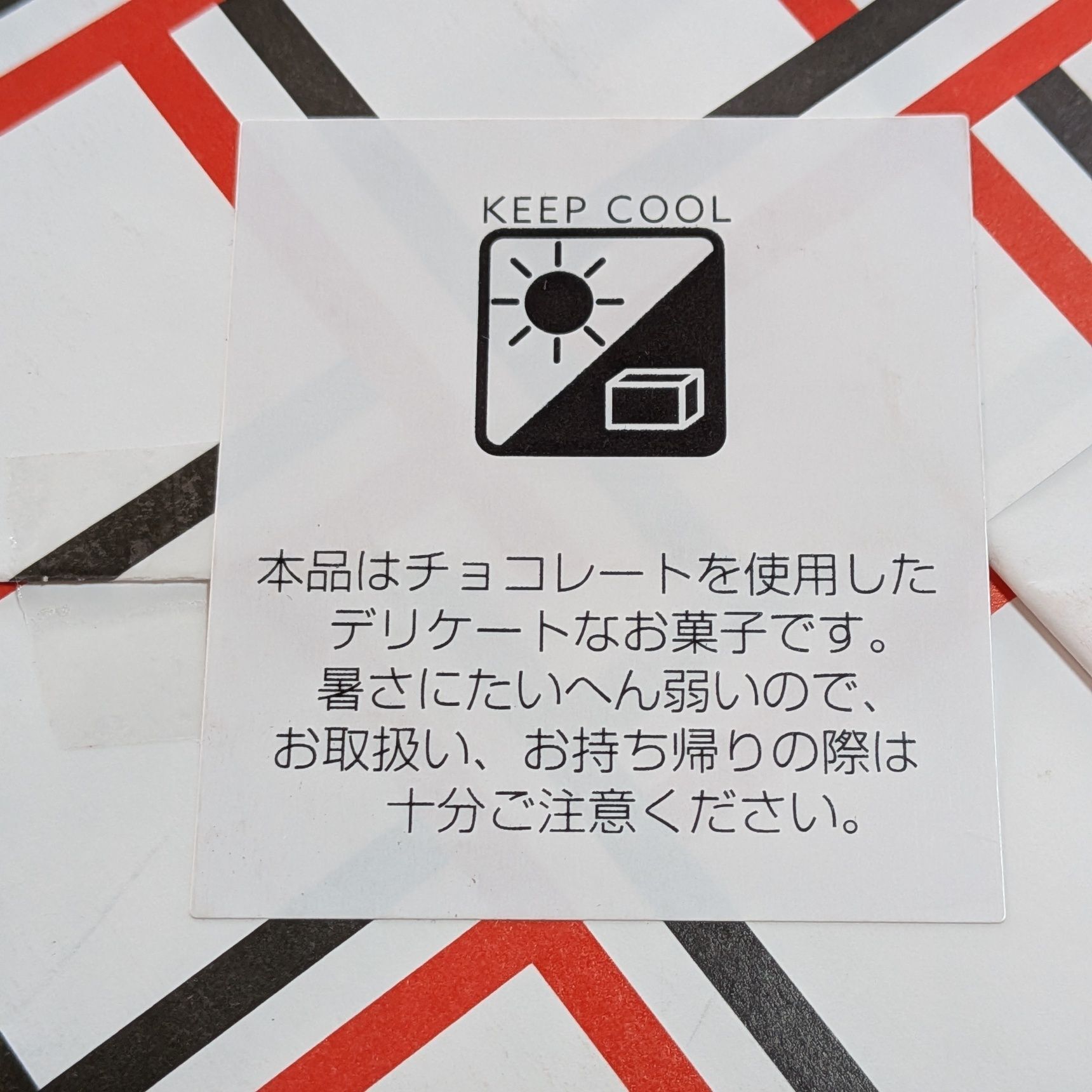 「本品はチョコレートを使用したデリケートなお菓子です。暑さにたいへん弱いので、お取り扱い、お持ち帰りの際は十分ご注意ください。」