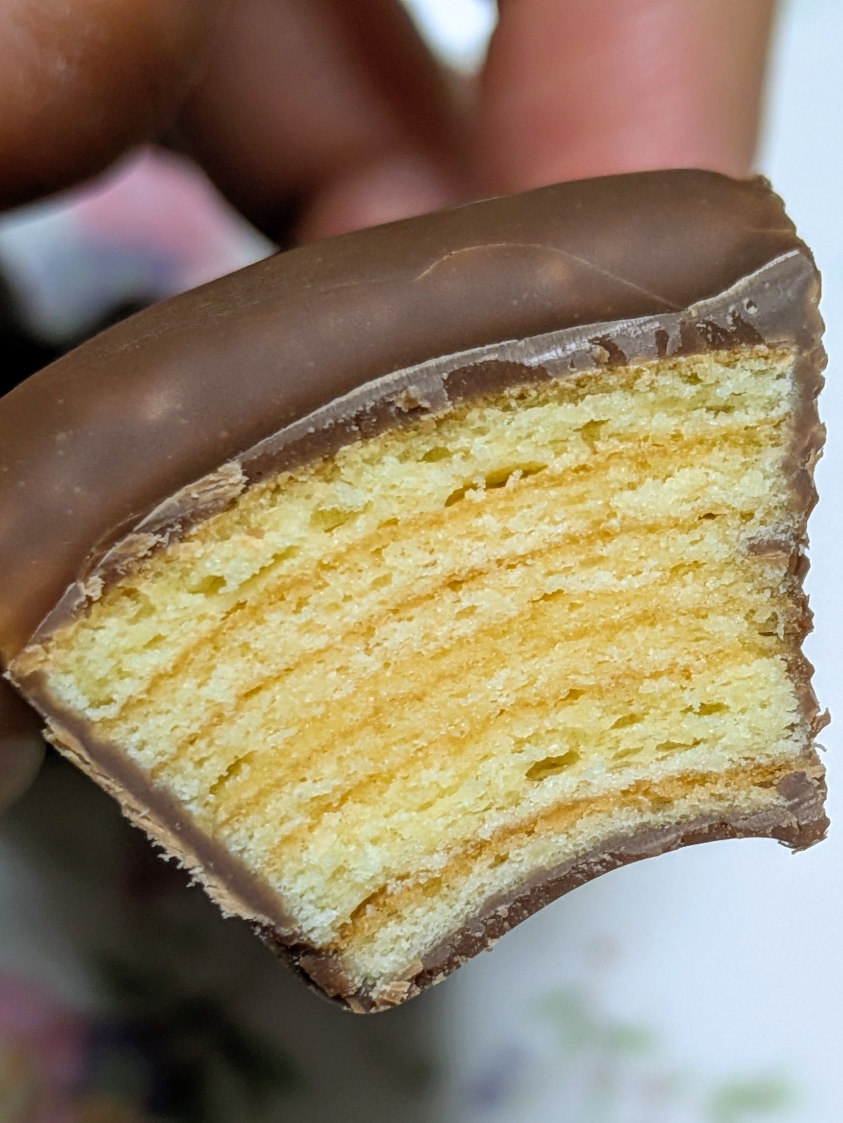 生地はふわっとしていてとても柔らかいです。チョコレートは表面が少しパリッととしているのですが口の中に入れるとすぐに溶けていきました。コーティングのチョコレートの量もちょうど良くバウムクーヘンとの一体感があり、チョコレートの主張が強すぎるということはありませんでした。バウムクーヘンが香りよく美味しいので、最後まで楽しんで味わうことが出来ました。