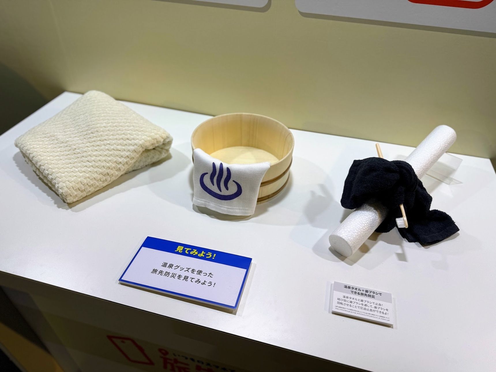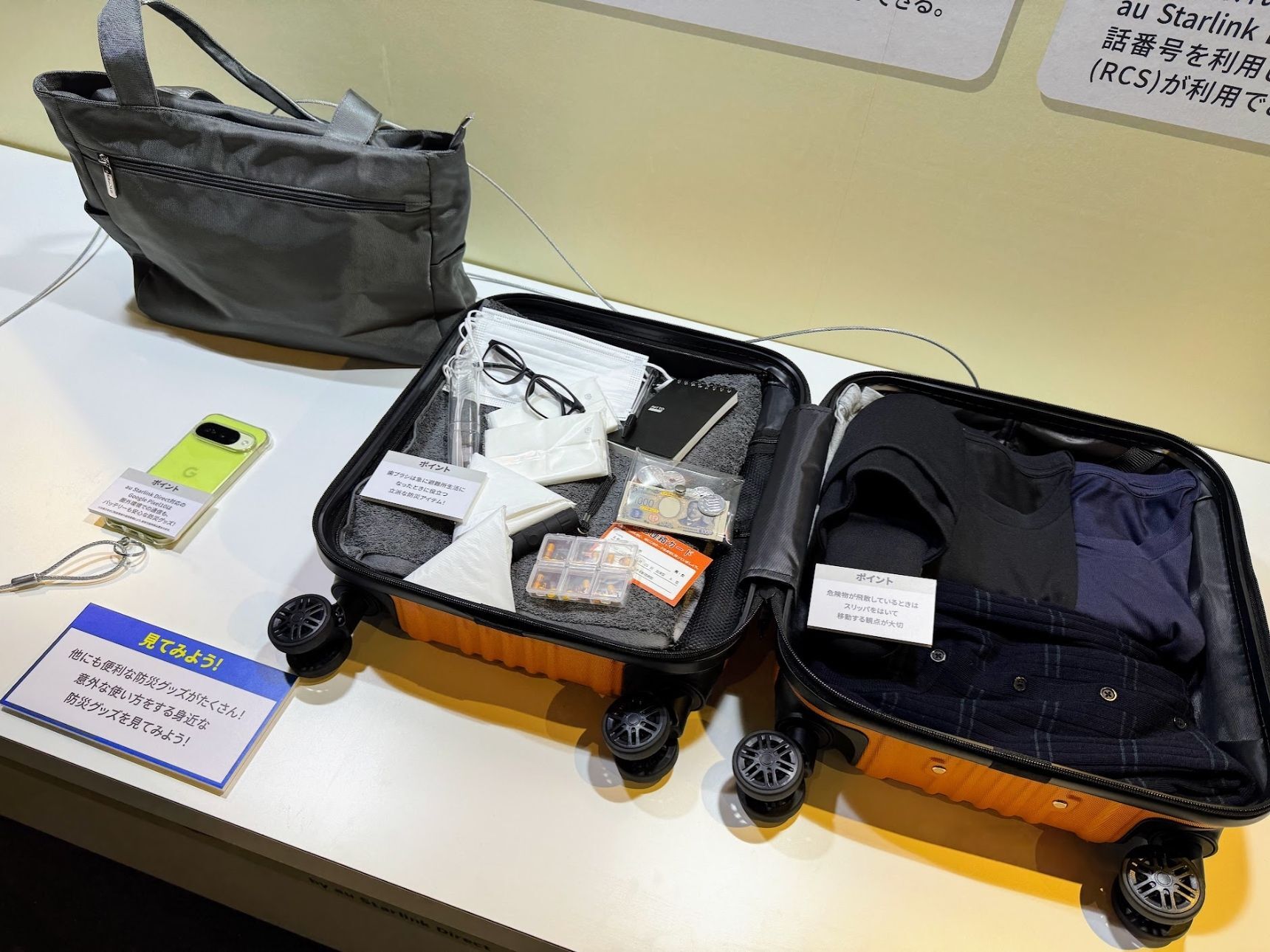 実際のスーツケースの展示もされていて、危険物の飛散に備えられるスリッパや避難所生活に役立つ歯ブラシ、長時間のバッテリー駆動のGoogle Pixel10などが役立つ身近な防災グッズとして紹介されていました。