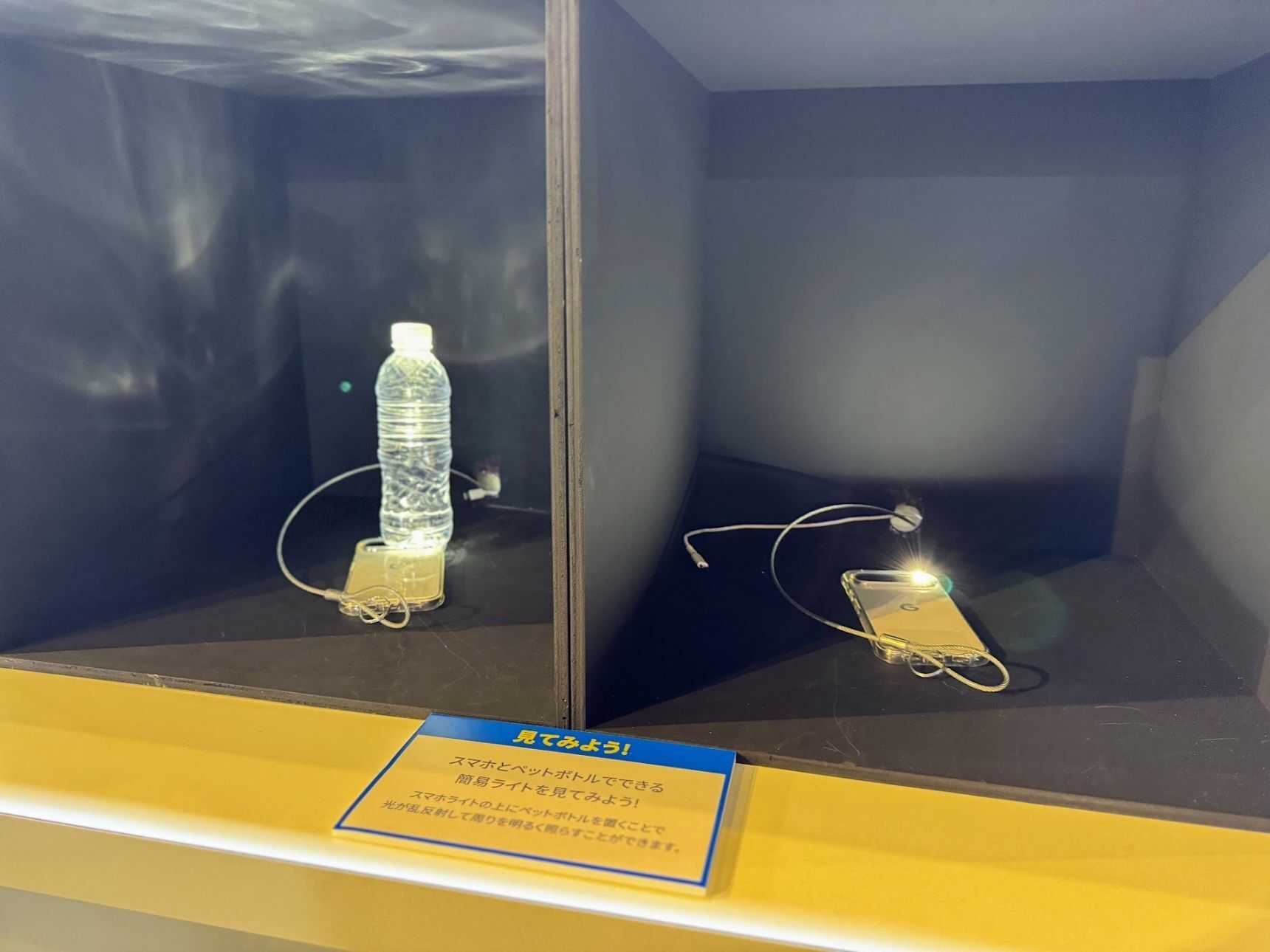 スマホだけの明かりと比べ、ペットボトルボトルをプラスした方が広範囲に明るさが広がることがわかりました。