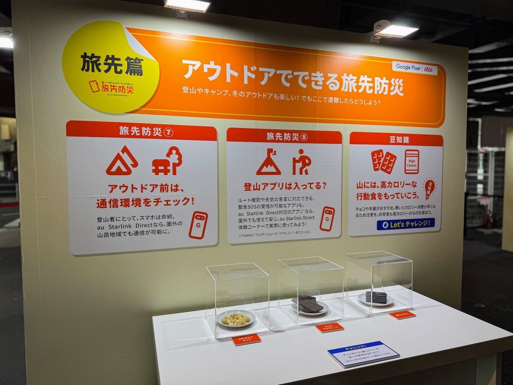 アウトドアでは、事前の通信環境チェックと登山アプリの準備、さらに少量で多くのエネルギーを摂取できる行動食選びのポイントをクイズ形式で学べるコーナーもありました。