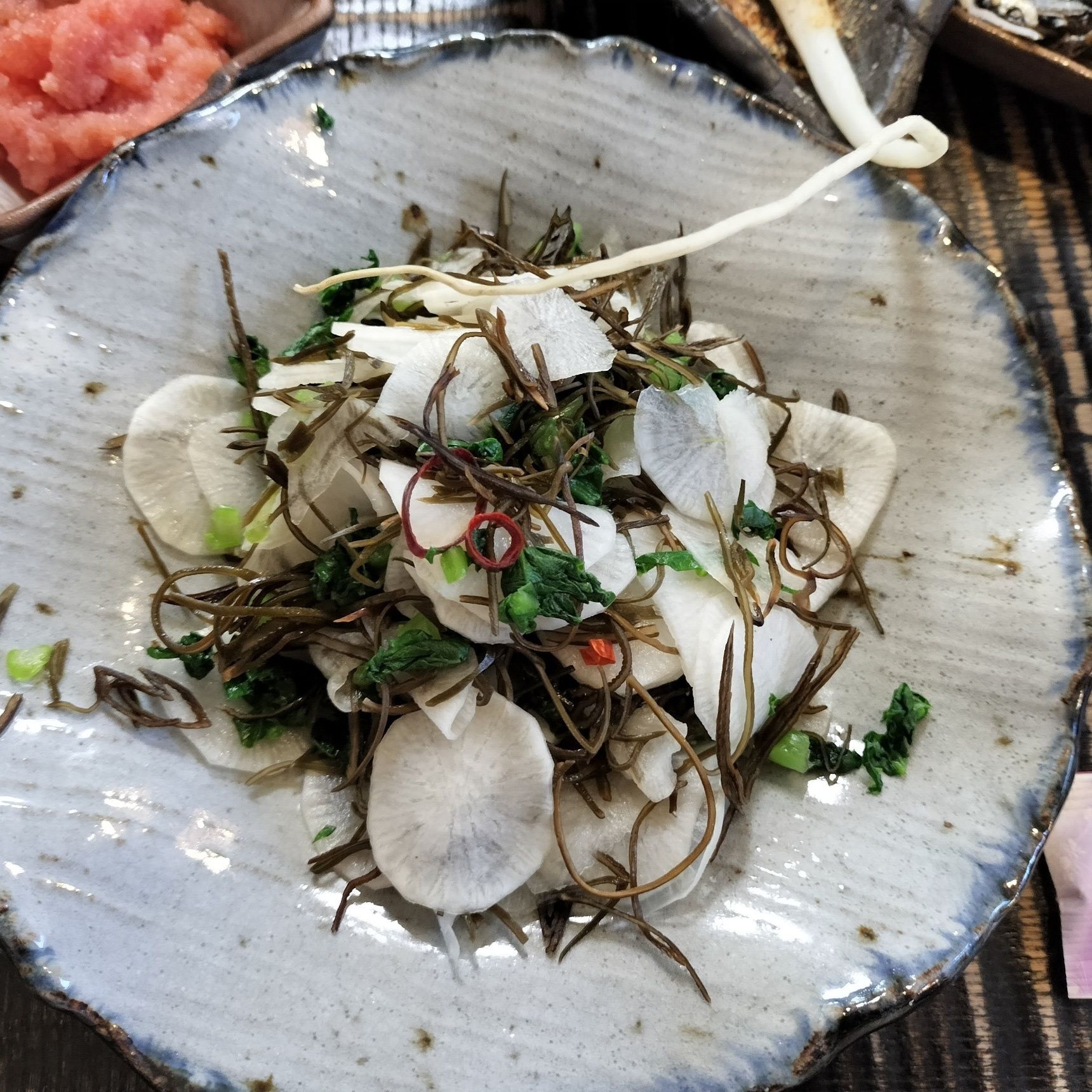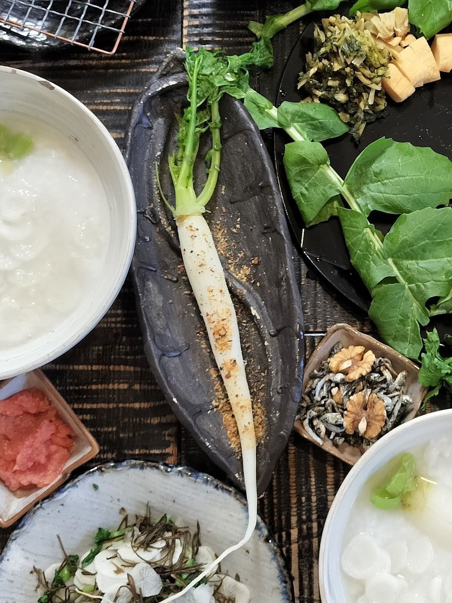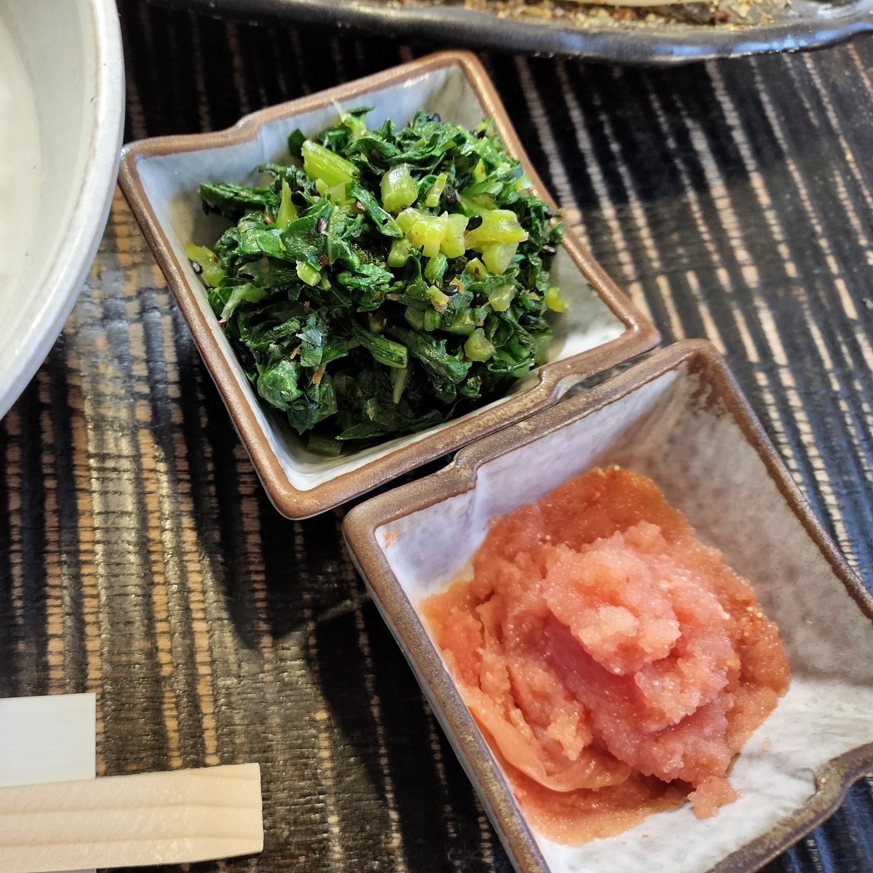 ※葉あり大根は器に盛り付け、煮干しをかける 【お浸し完成】食べる直前に醤油をかけて、いただきまーす!