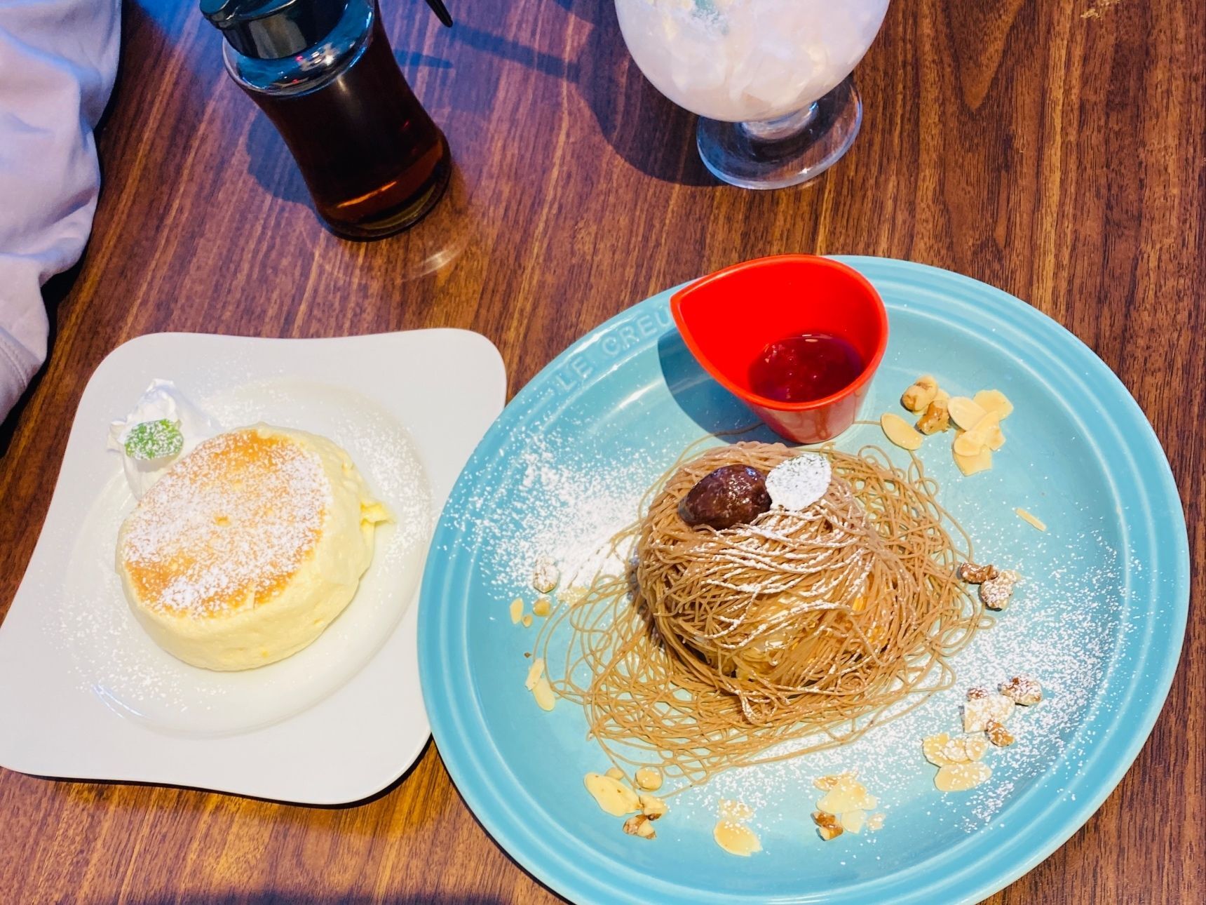 向かって左側がむさしの森珈琲特製ふわっとパンケーキ蜂蜜入メイプルシロップ添え