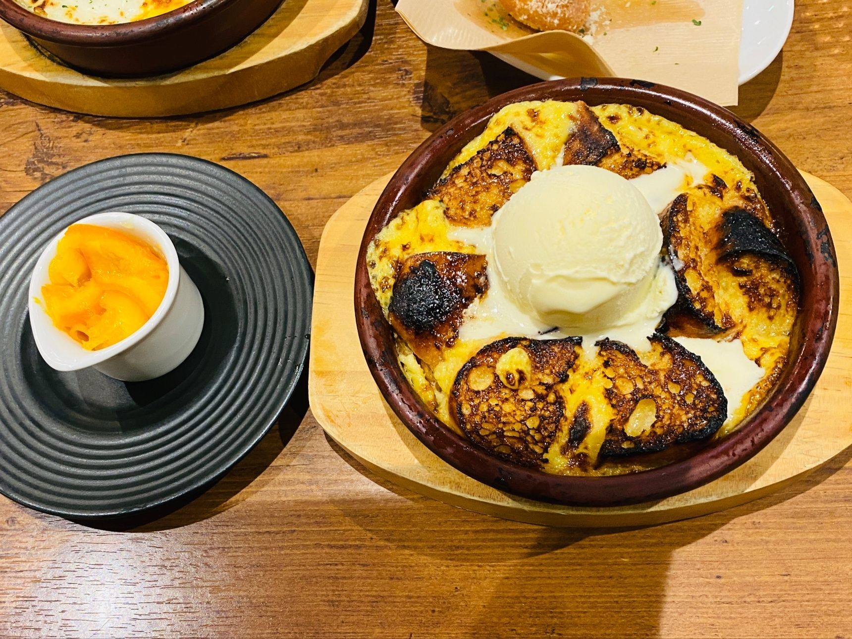 卵をたっぷり使った熱々のパンプディングにバニラジェートがトッピング!