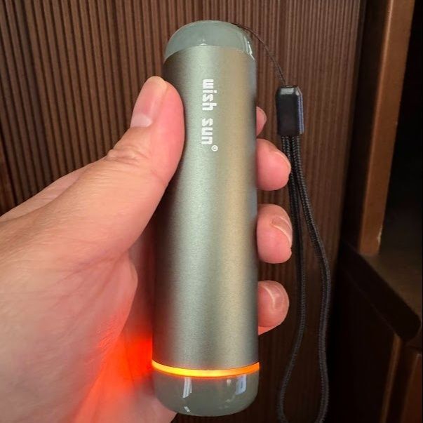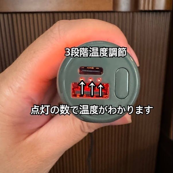 温度調節もできます。電源をつけると弱、もう一度クリックで強です。電源ライトの色で温度の違いがわかります。3段階の温度設定(弱モード:40℃-45℃・中モード:45℃- 50℃・強モード:50℃-55℃)